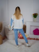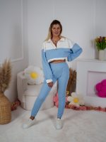 Dzianinowy komplet dresowy Color Block bluza Multiway 2w1 ze stójką i dopasowane spodnie ecru-błękitny