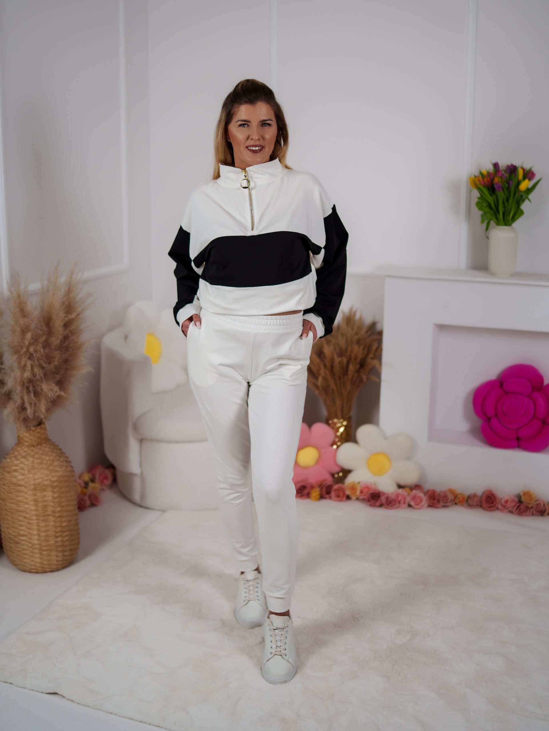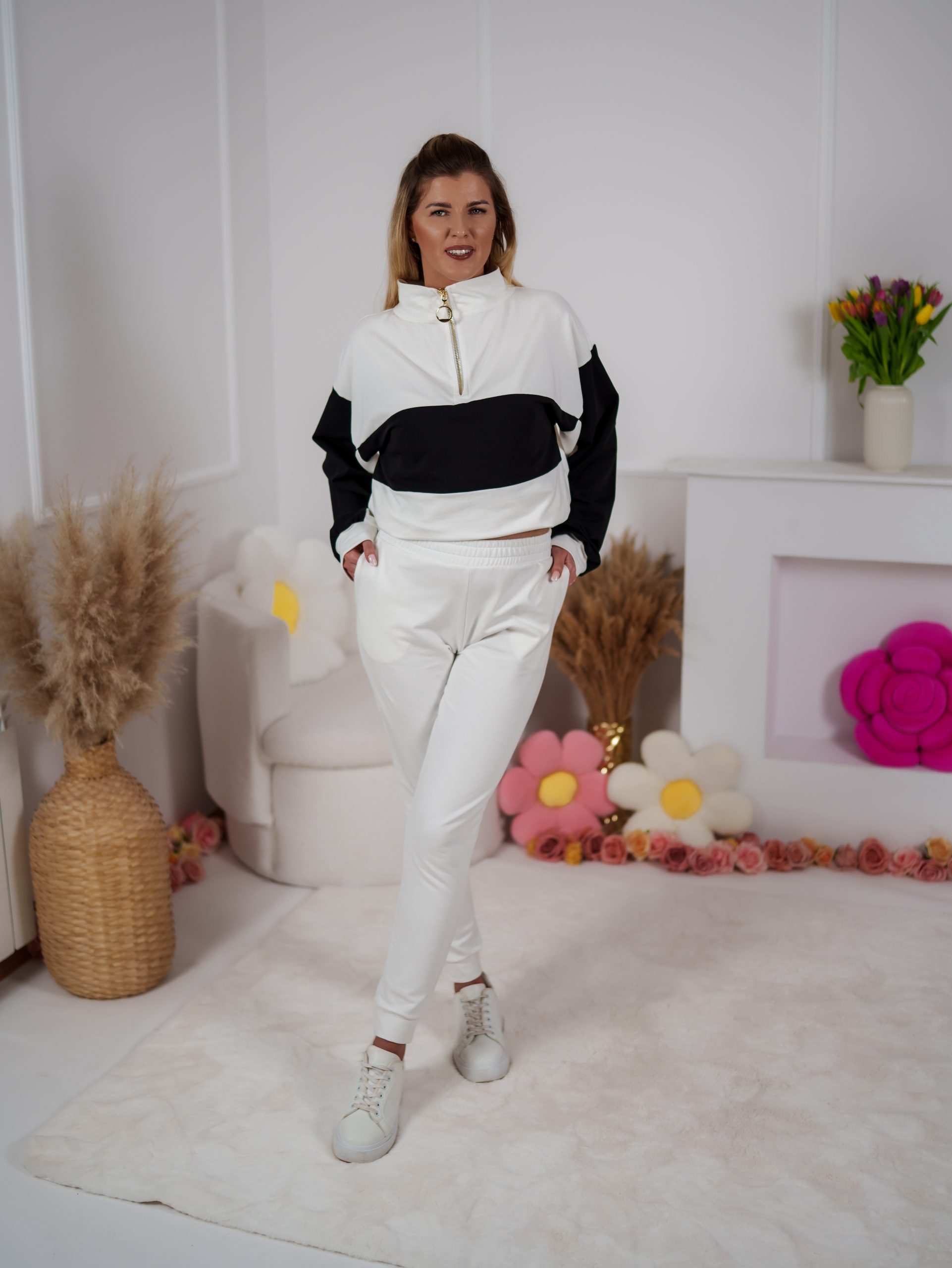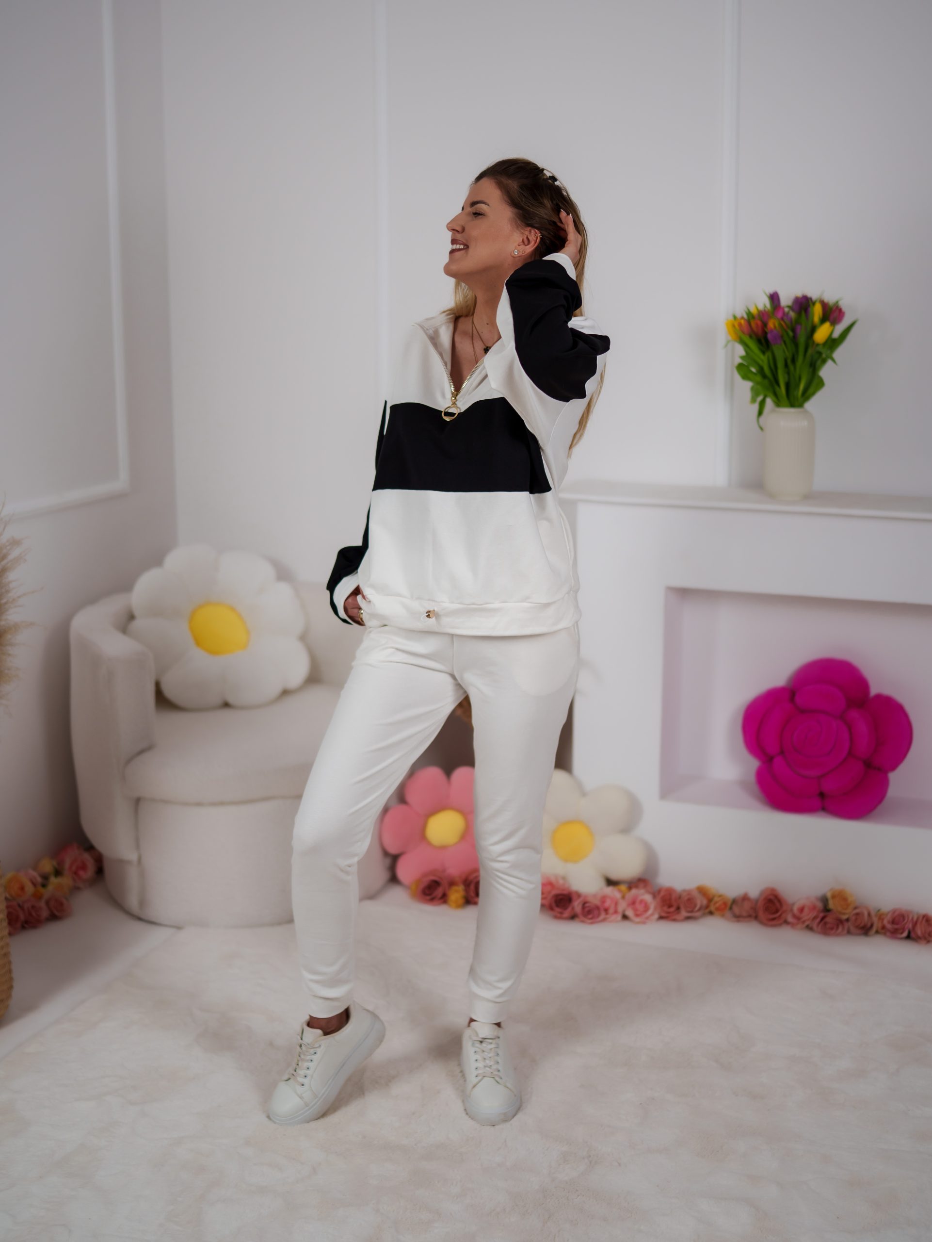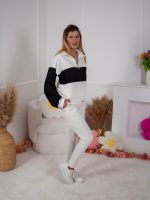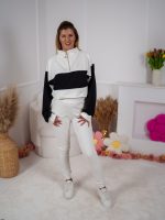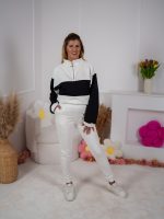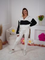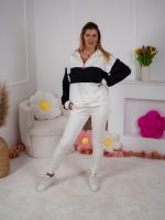 Dwukolorowa bluza ze stójką, zapinana na elegancki złoty suwak, przyciąga uwagę minimalistycznym, ale efektownym designem. Dzięki regulacji stoperem możesz nosić ją na różne sposoby – luźno lub bardziej dopasowaną. W zestawie znajdują się dopasowane spodnie, które pięknie podkreślają figurę a jednocześnie zapewniają swobodę ruchów.