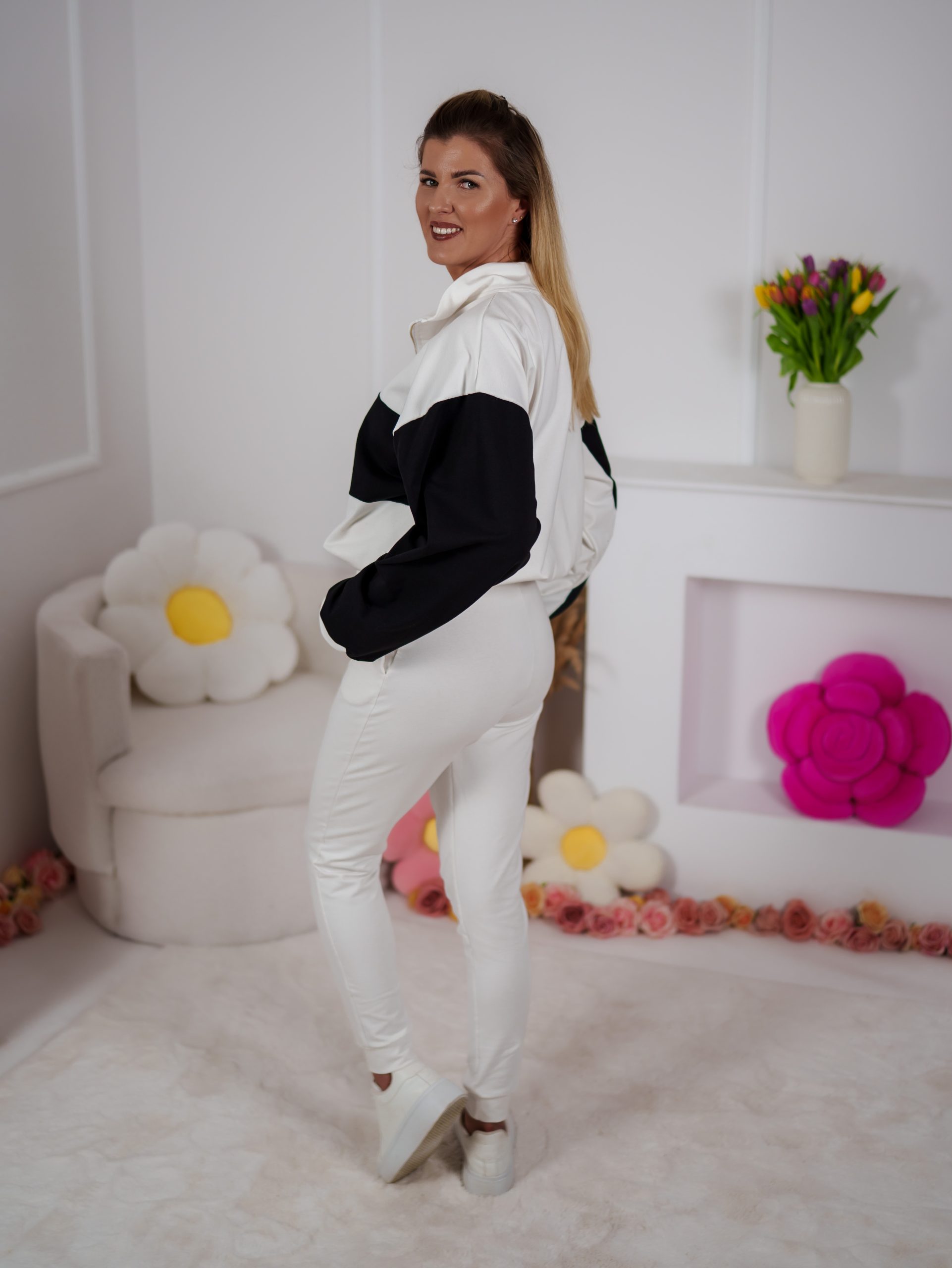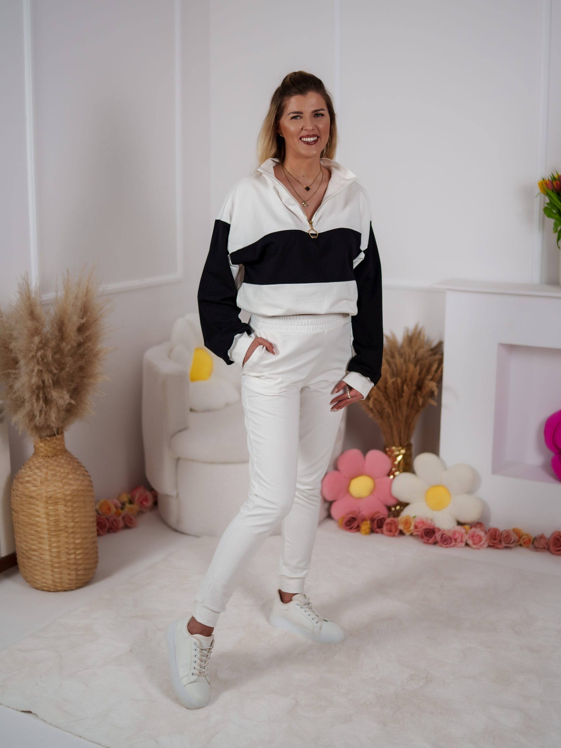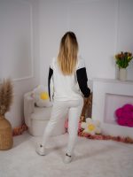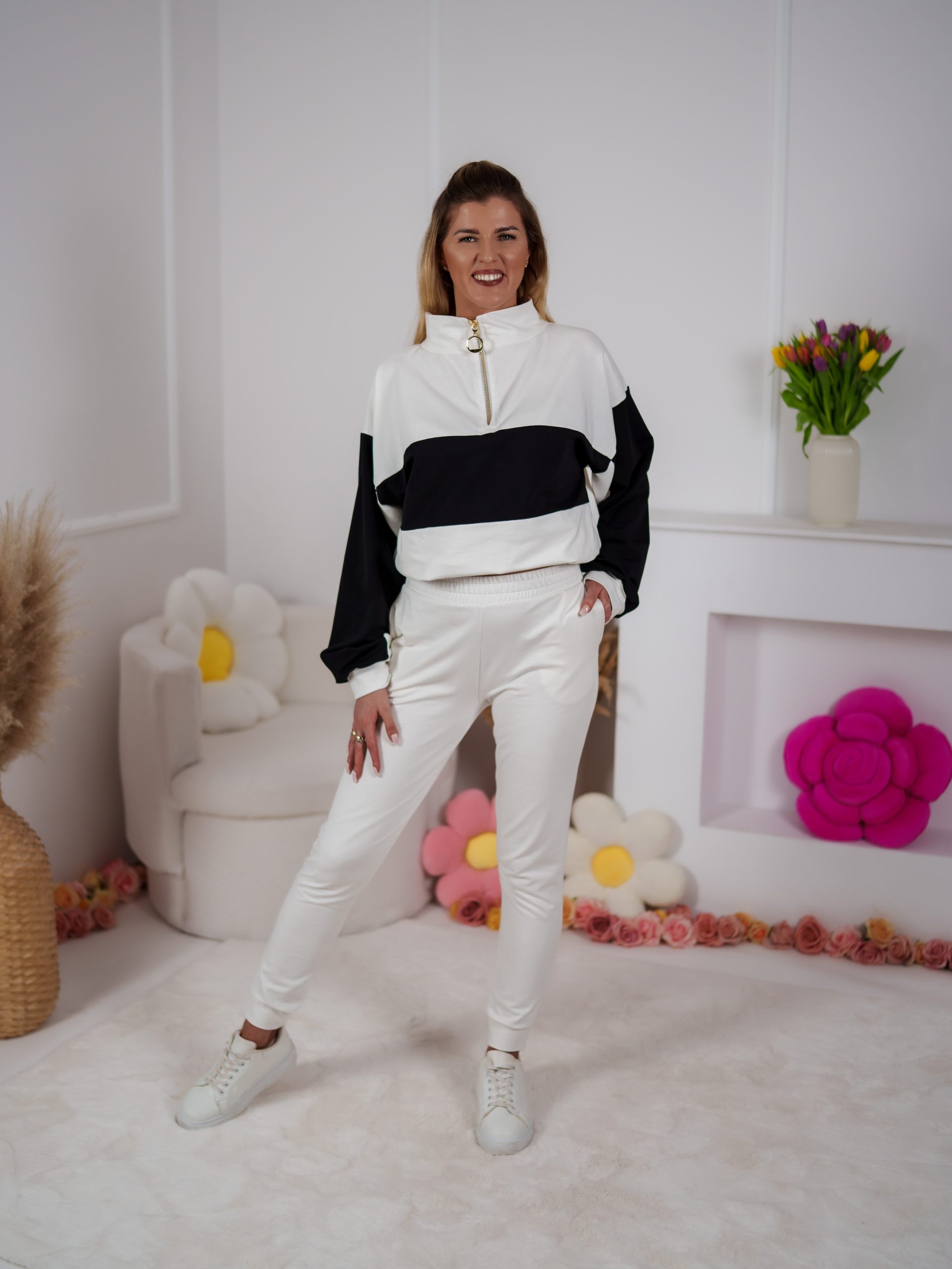 Dwukolorowa bluza ze stójką, zapinana na elegancki złoty suwak, przyciąga uwagę minimalistycznym, ale efektownym designem. Dzięki regulacji stoperem możesz nosić ją na różne sposoby – luźno lub bardziej dopasowaną. W zestawie znajdują się dopasowane spodnie, które pięknie podkreślają figurę a jednocześnie zapewniają swobodę ruchów.