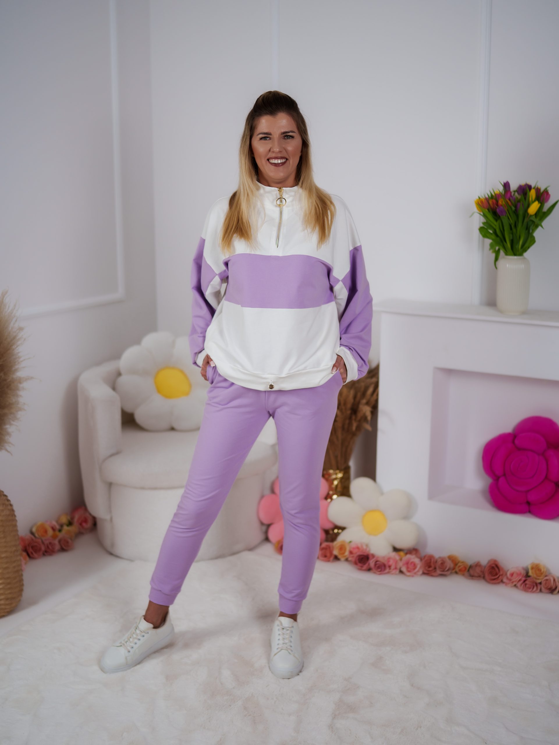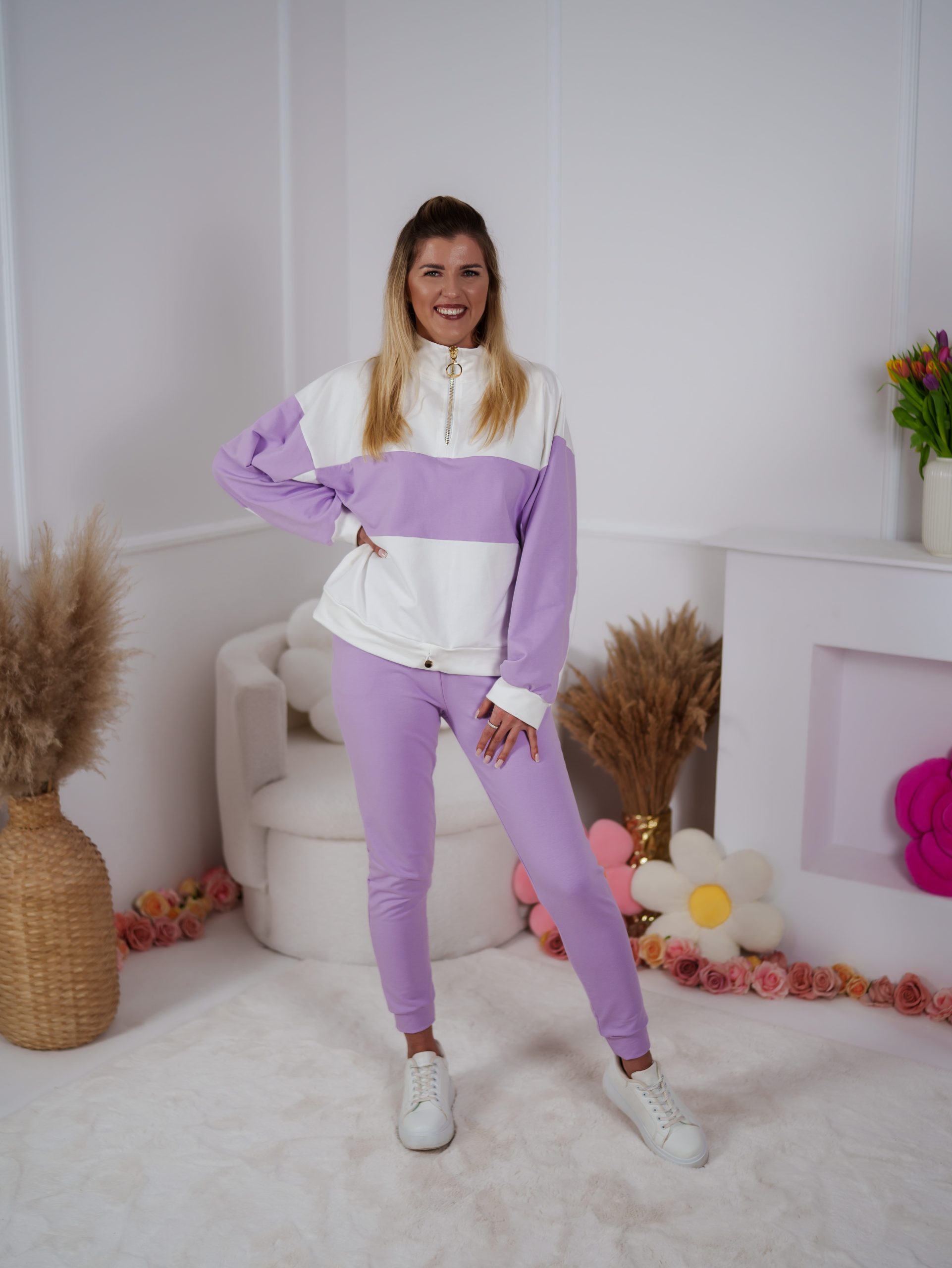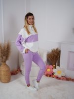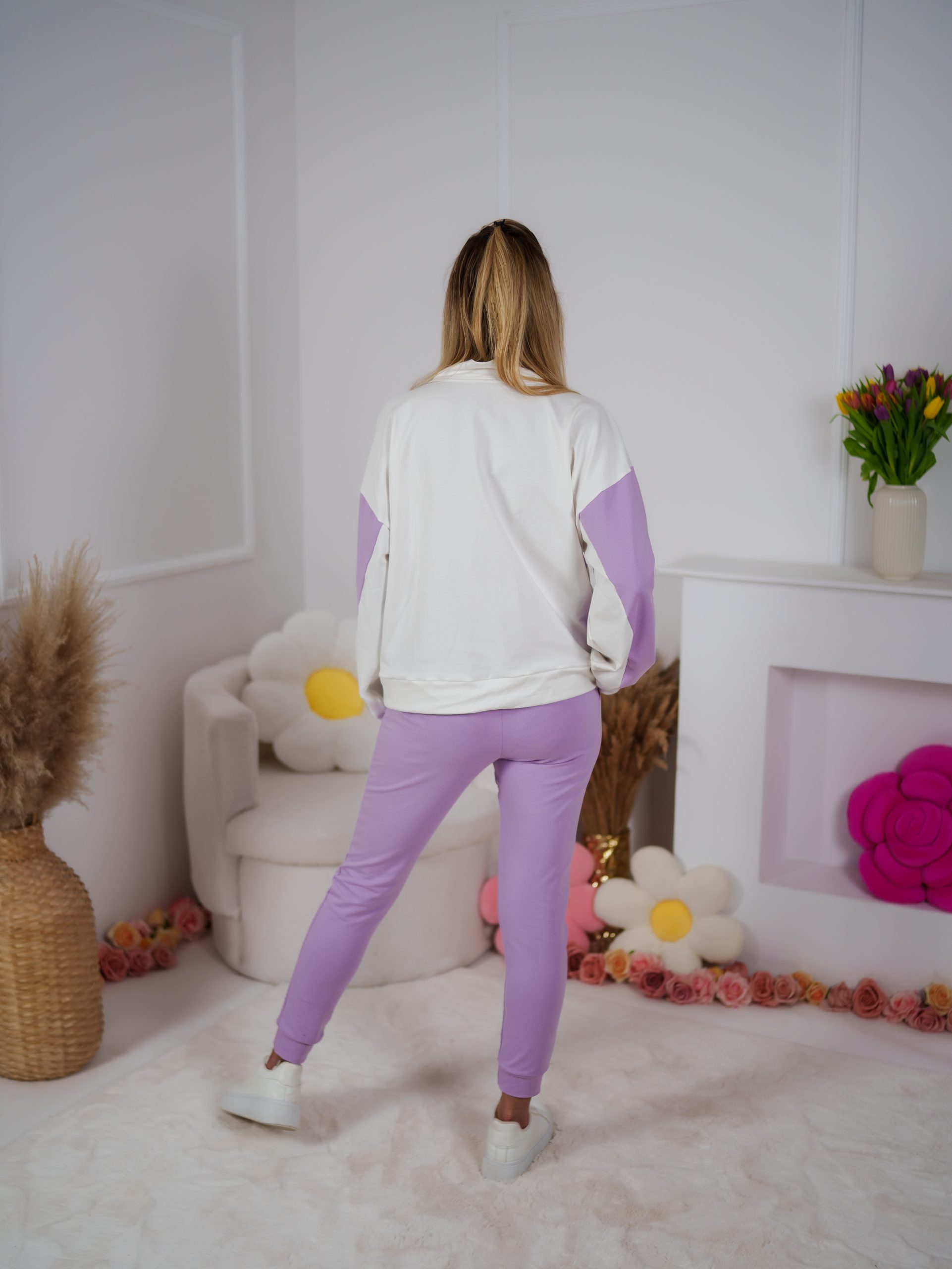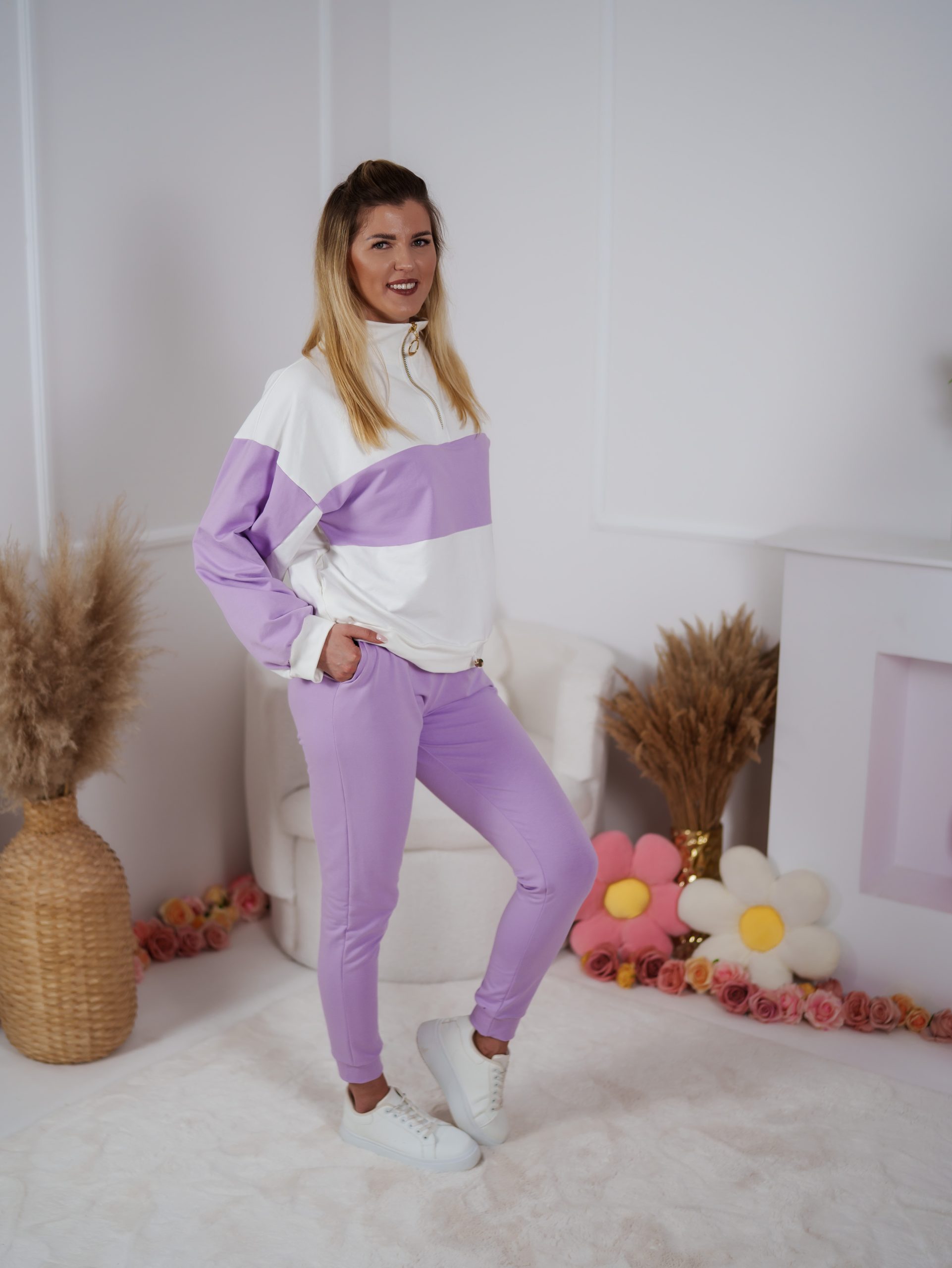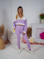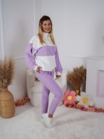 Dzianinowy komplet dresowy Color Block bluza Multiway 2w1 ze stójką i dopasowane spodnie ecru-liliowy