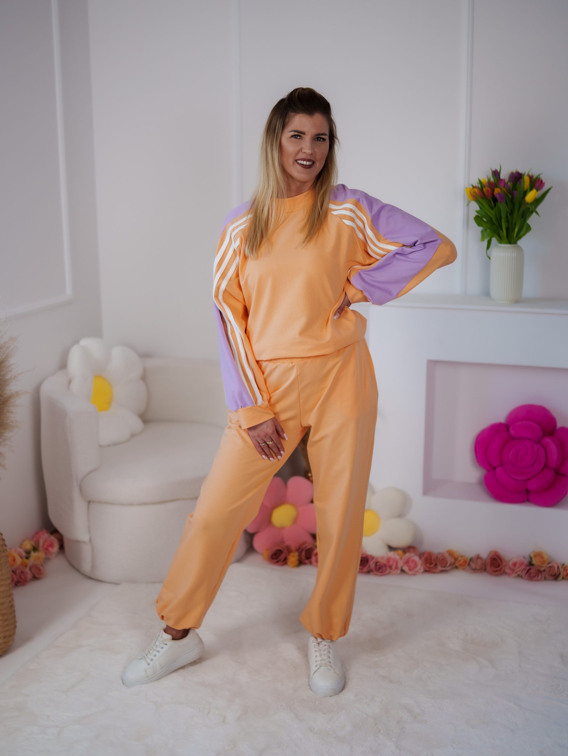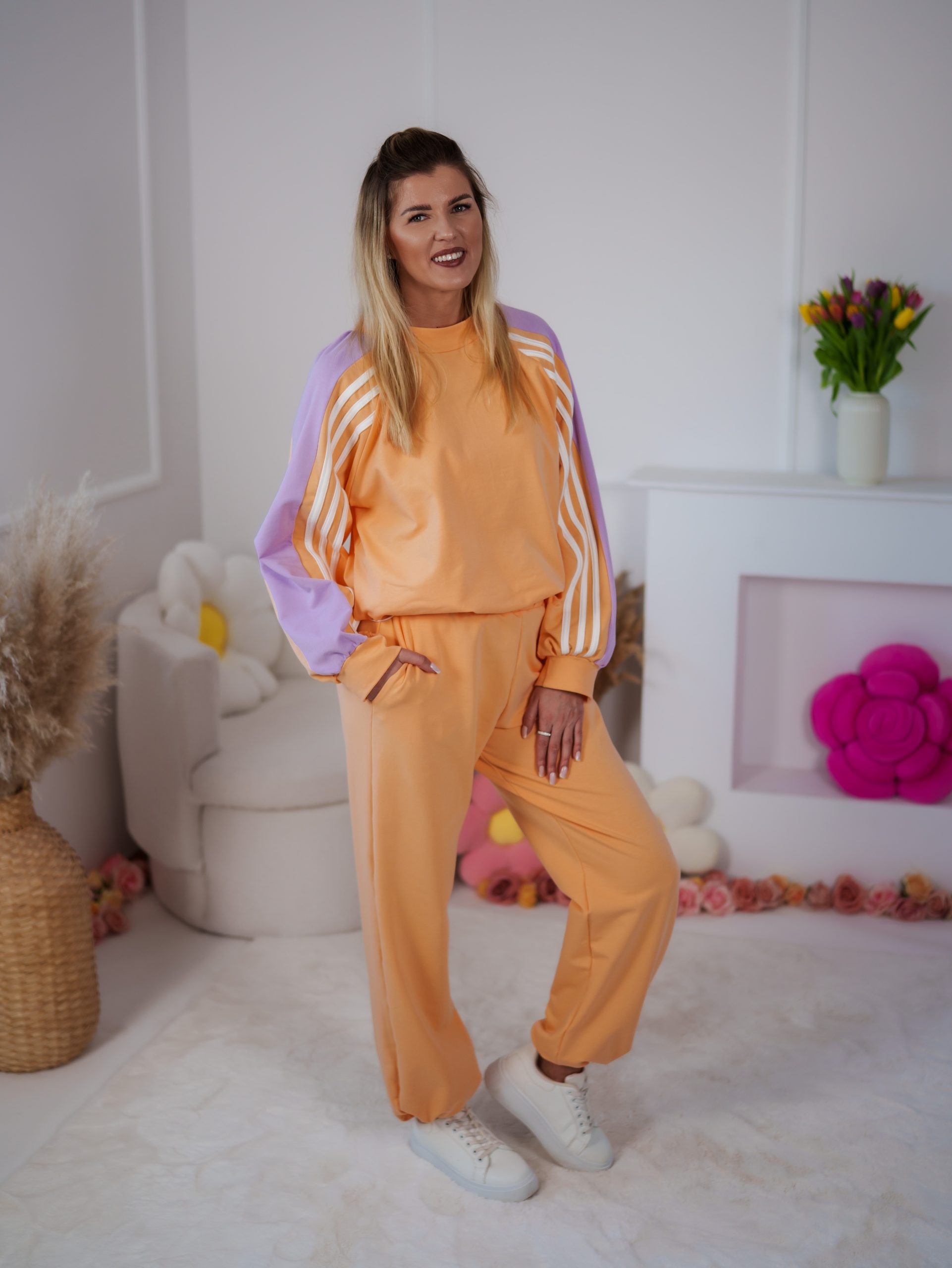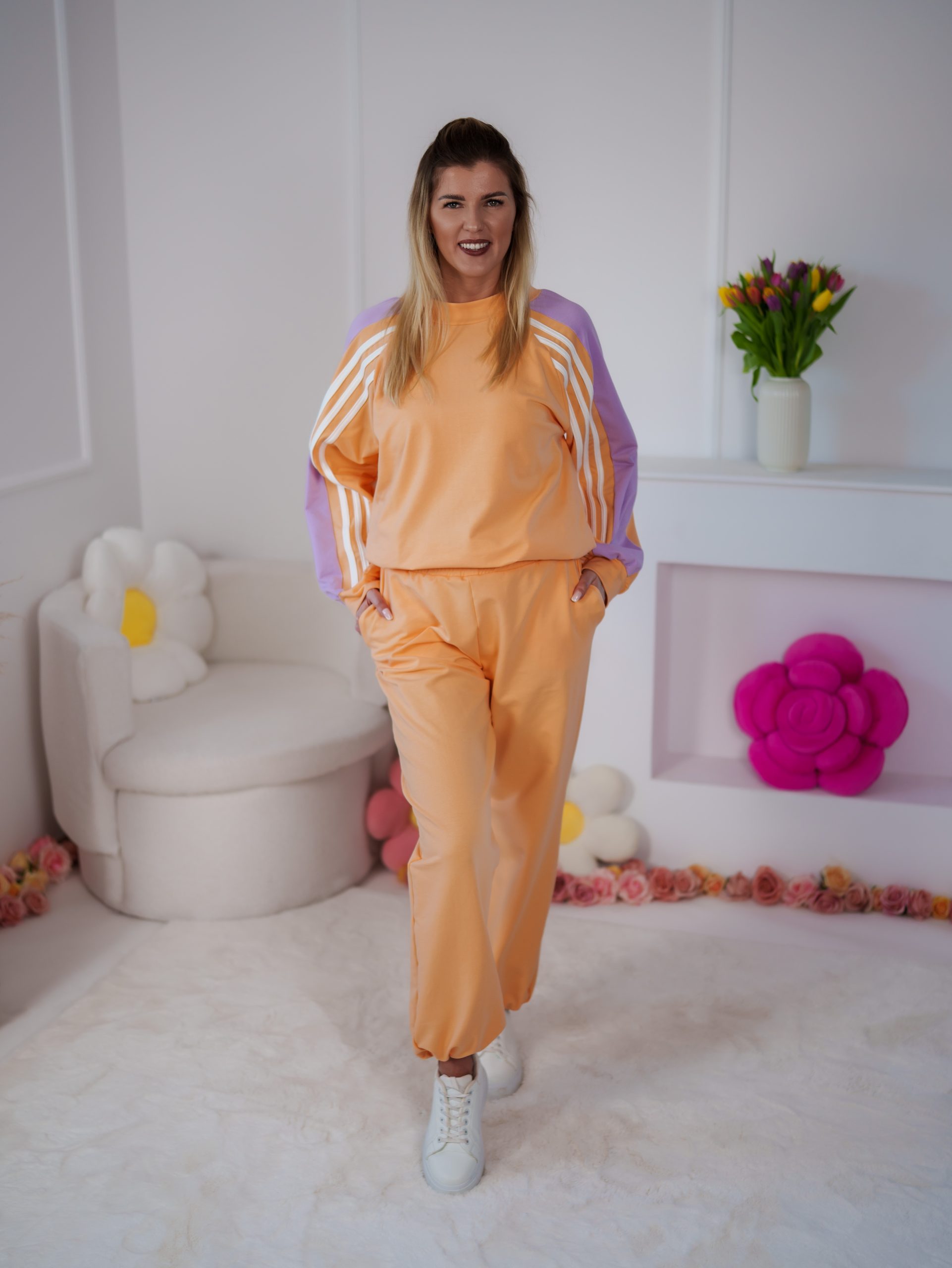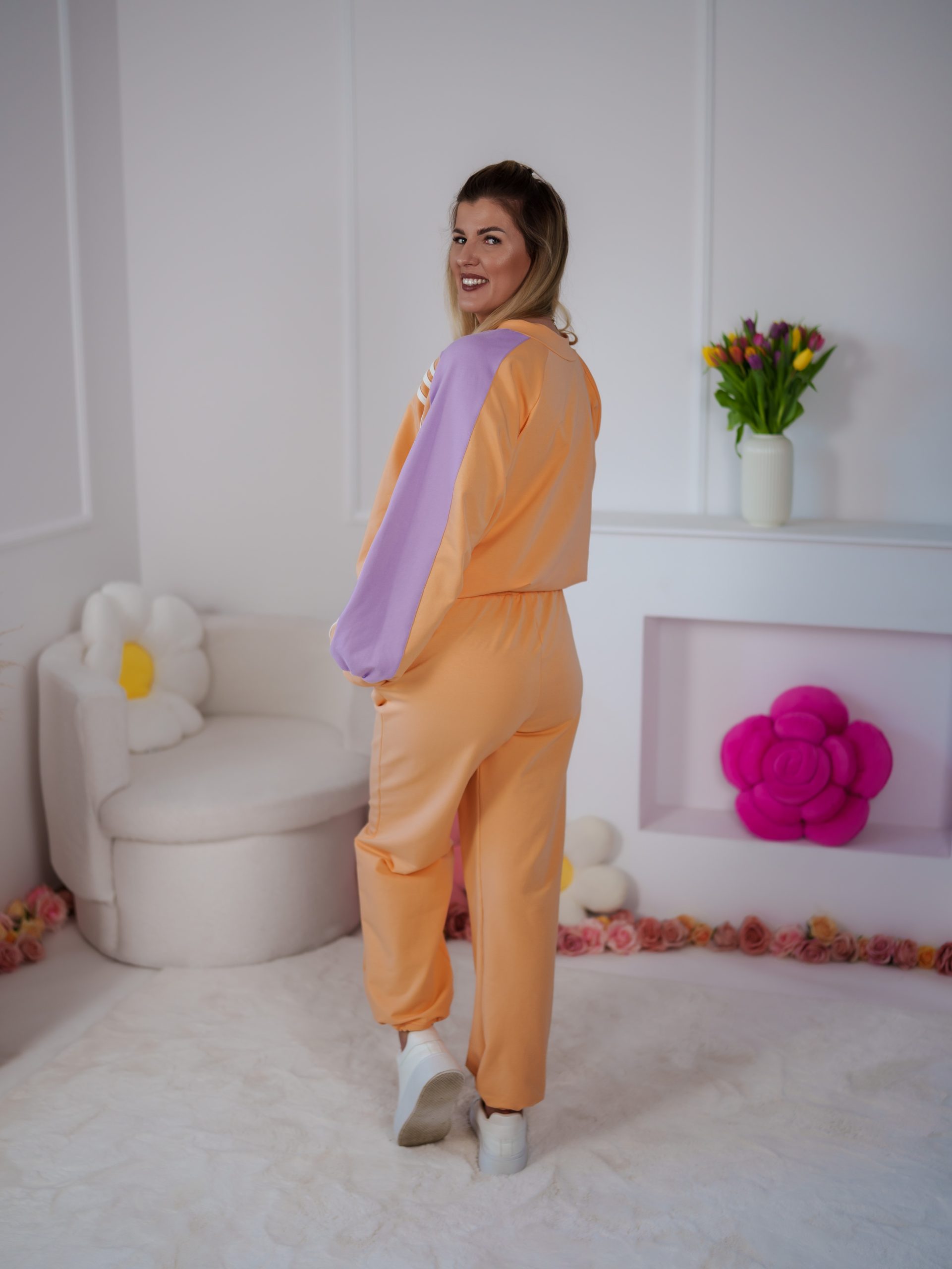 Dzianinowy komplet dresowy Color Block z lampasami i stoperami liliowo-pomarańczowy