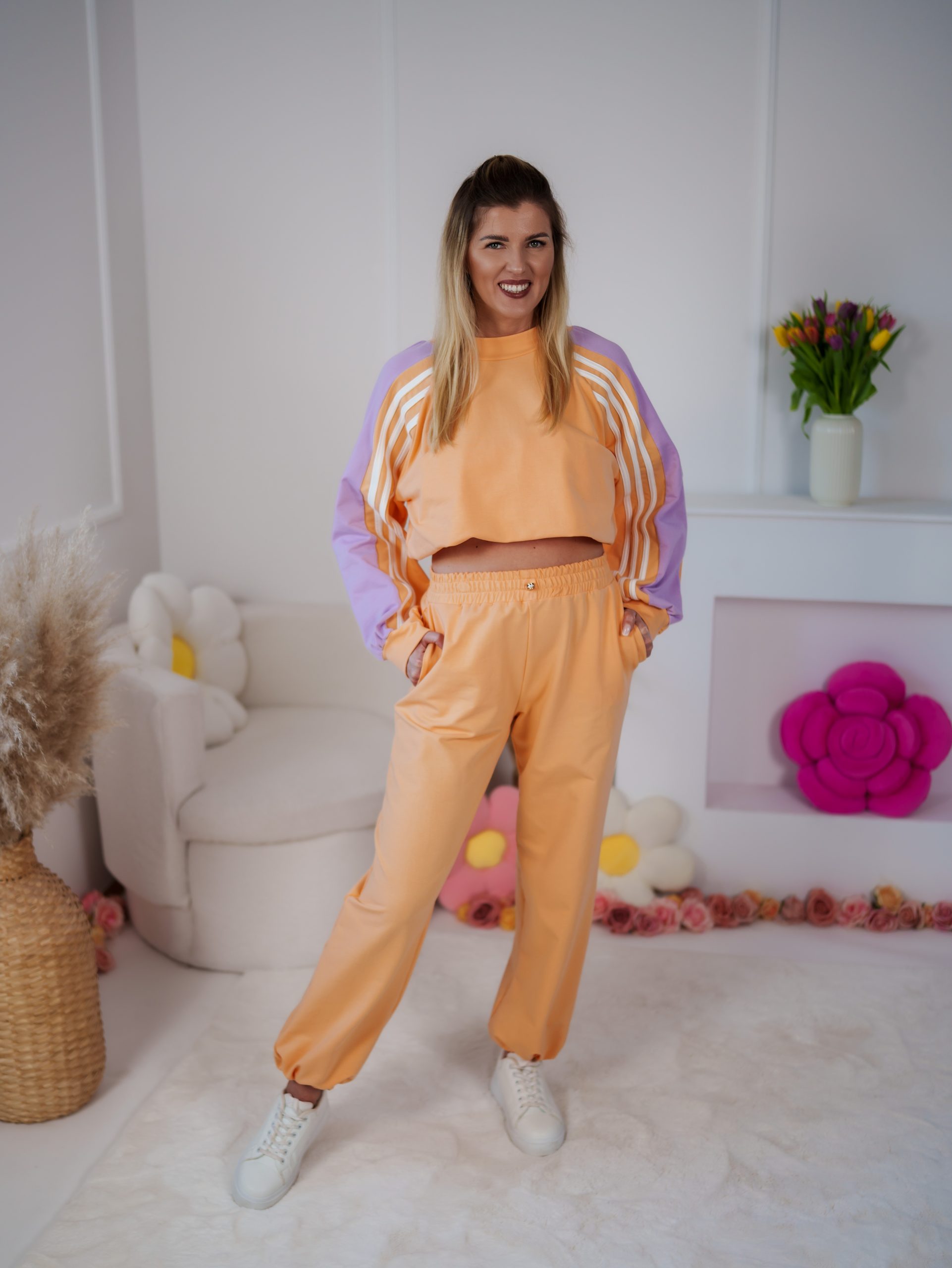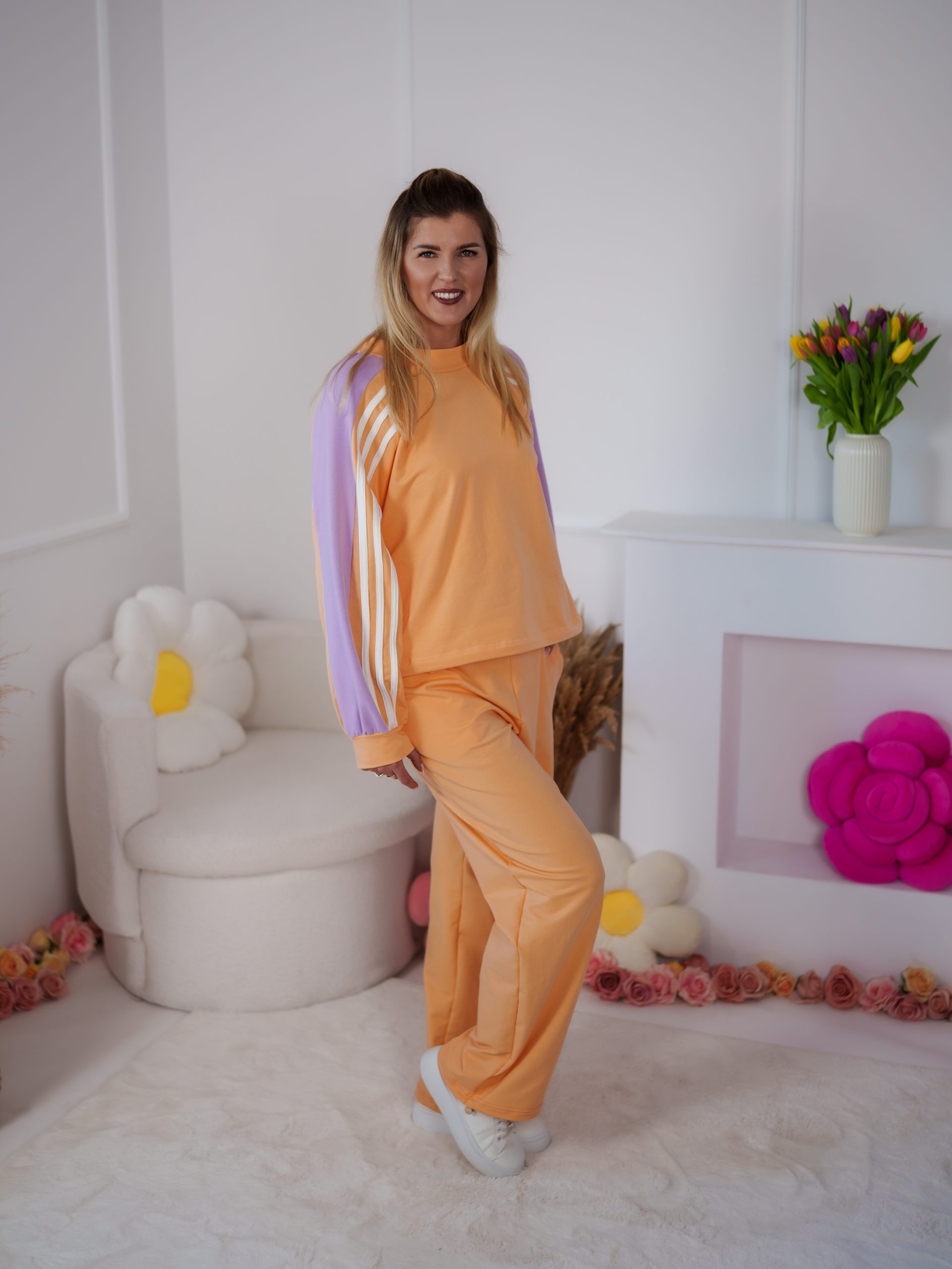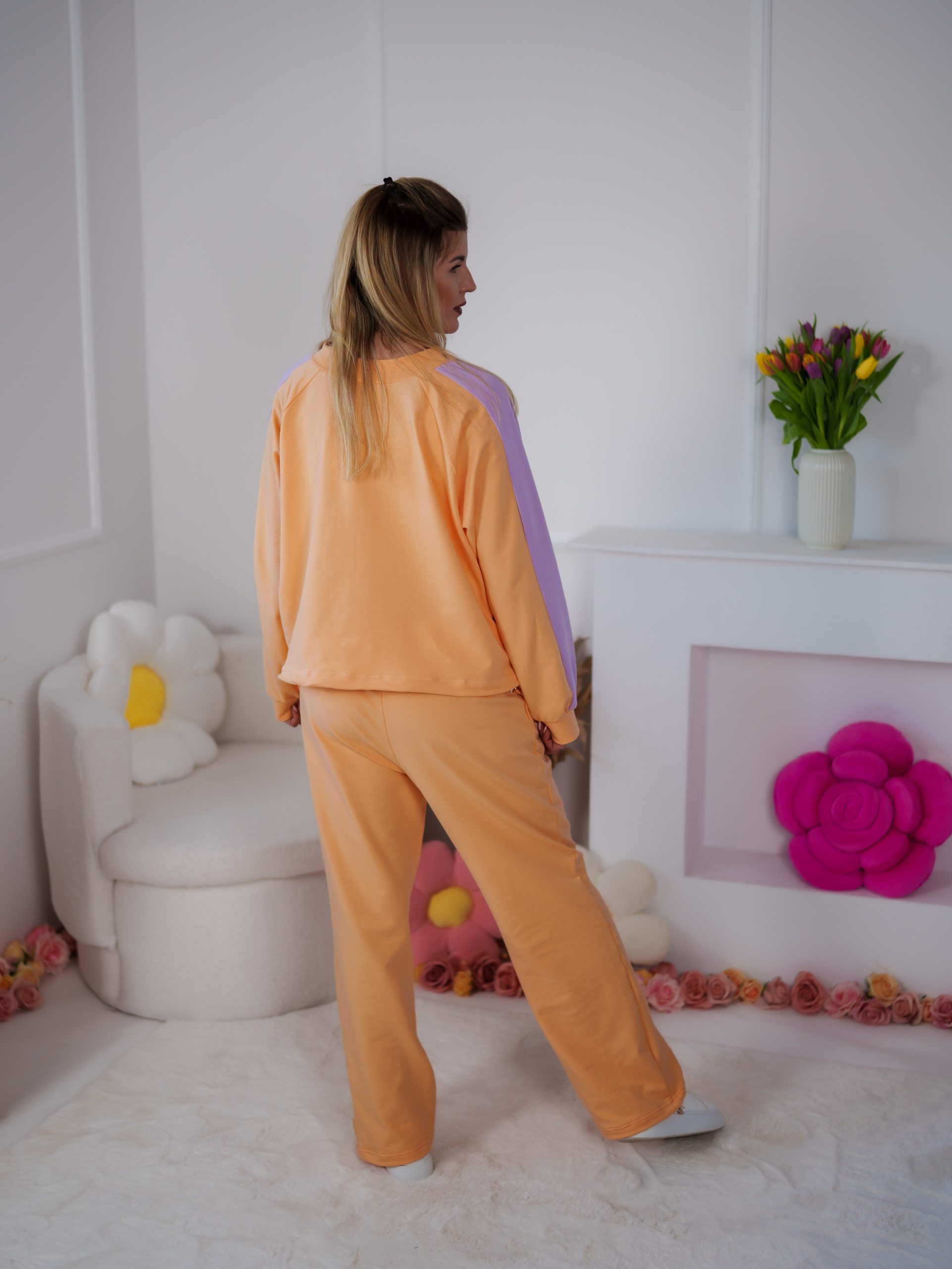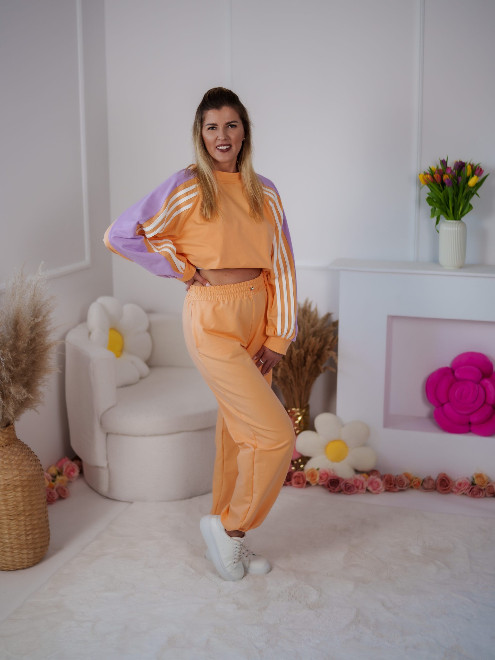 Dzianinowy komplet dresowy Color Block z lampasami i stoperami liliowo-pomarańczowy