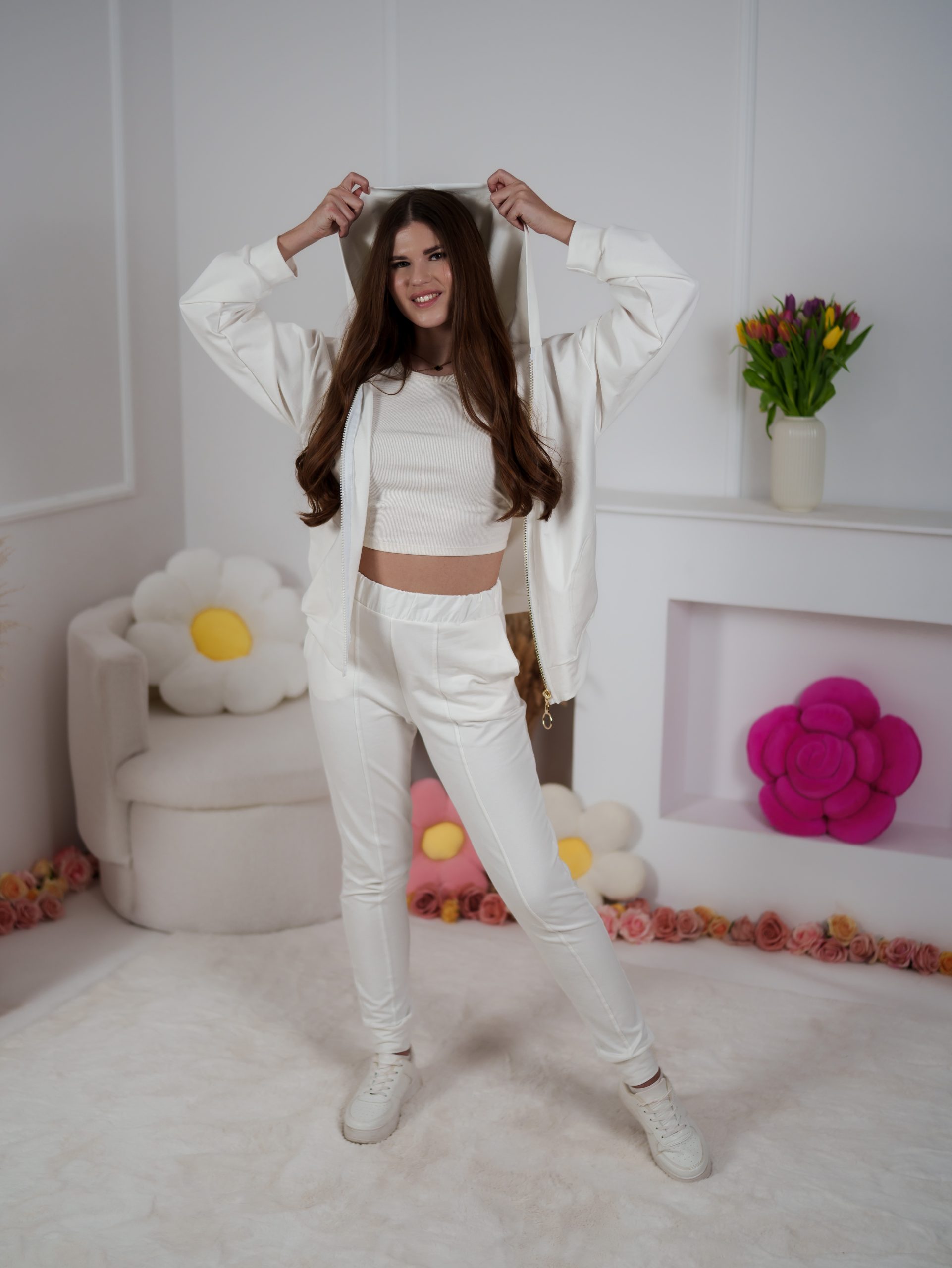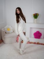 Bluza w kroju oversize, zapinana na elegancki złoty suwak, miękko otula sylwetkę niczym kocyk, dając poczucie ciepła i swobody. W zestawie znajdują się też spodnie o dopasowanym kroju, które zostały wzbogacone o ozdobne przeszycia z przodu, optycznie wydłużające i wysmuklające nogi.