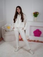 Dzianinowy komplet dresowy rozpinana bluza oversize i dopasowane spodnie z ozdobnymi przeszyciami ecru