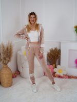 Komplet dresowy z weluru Velvet dopasowana rozpinana bluza i spodnie z lampasami beż