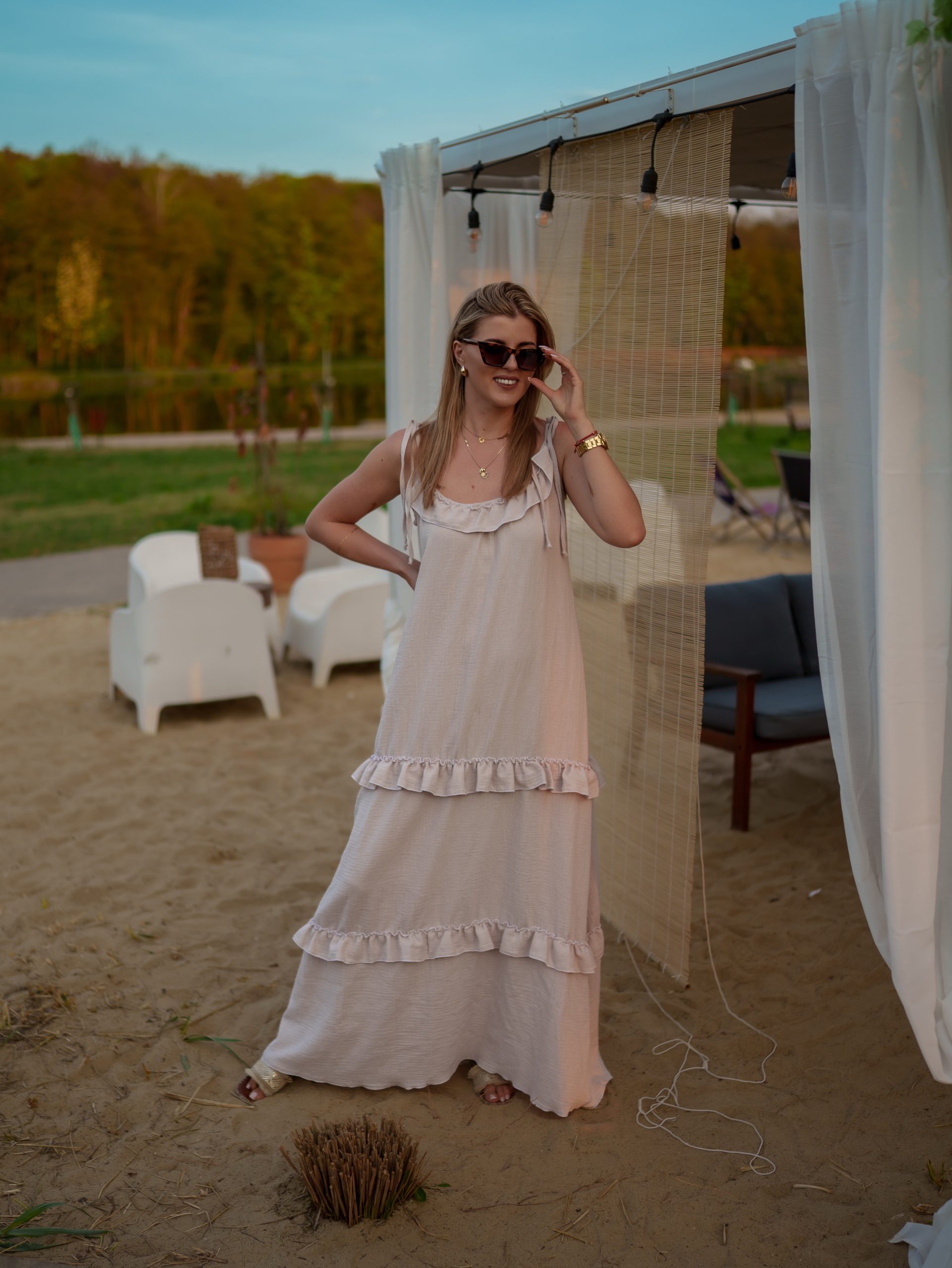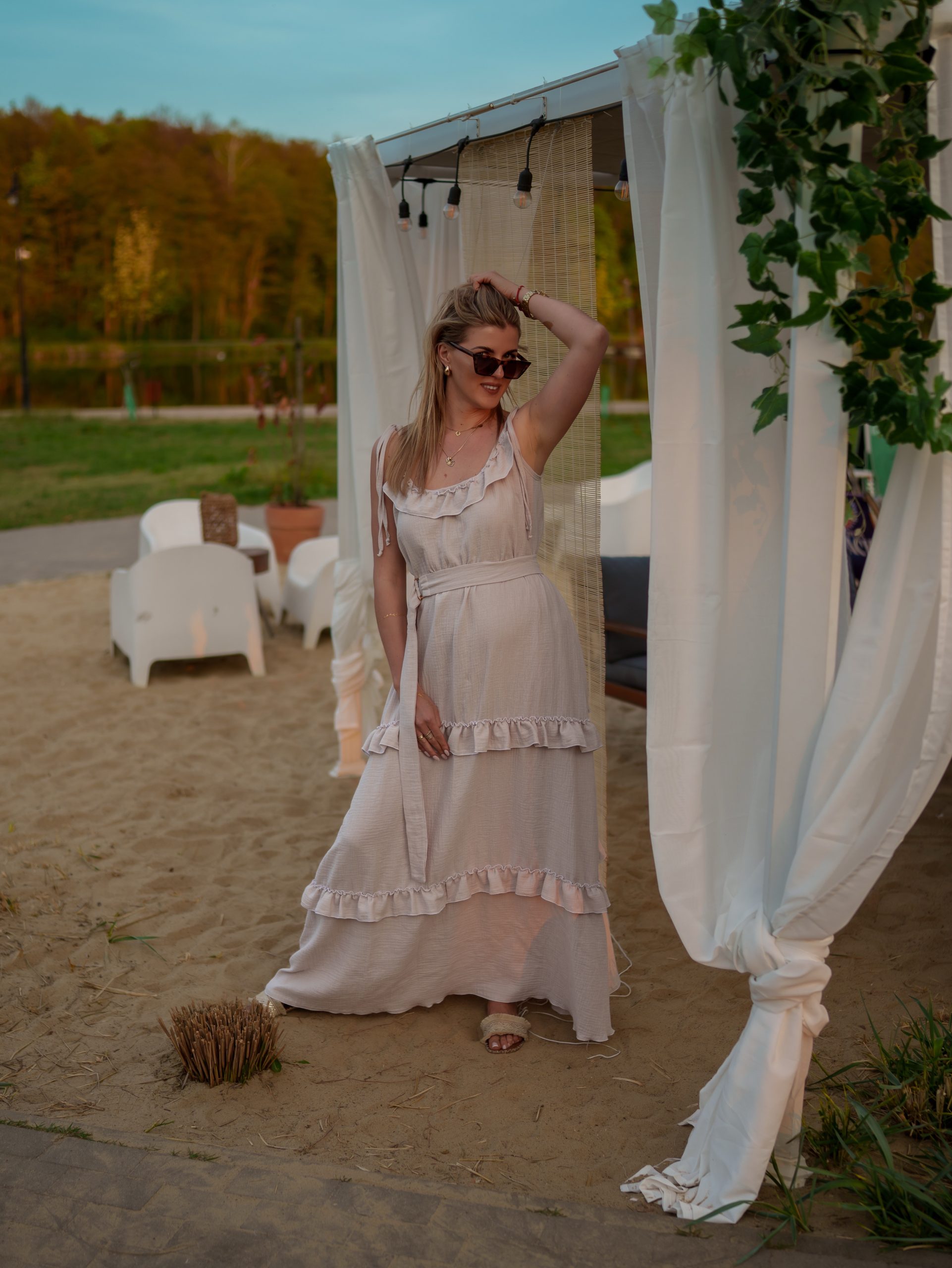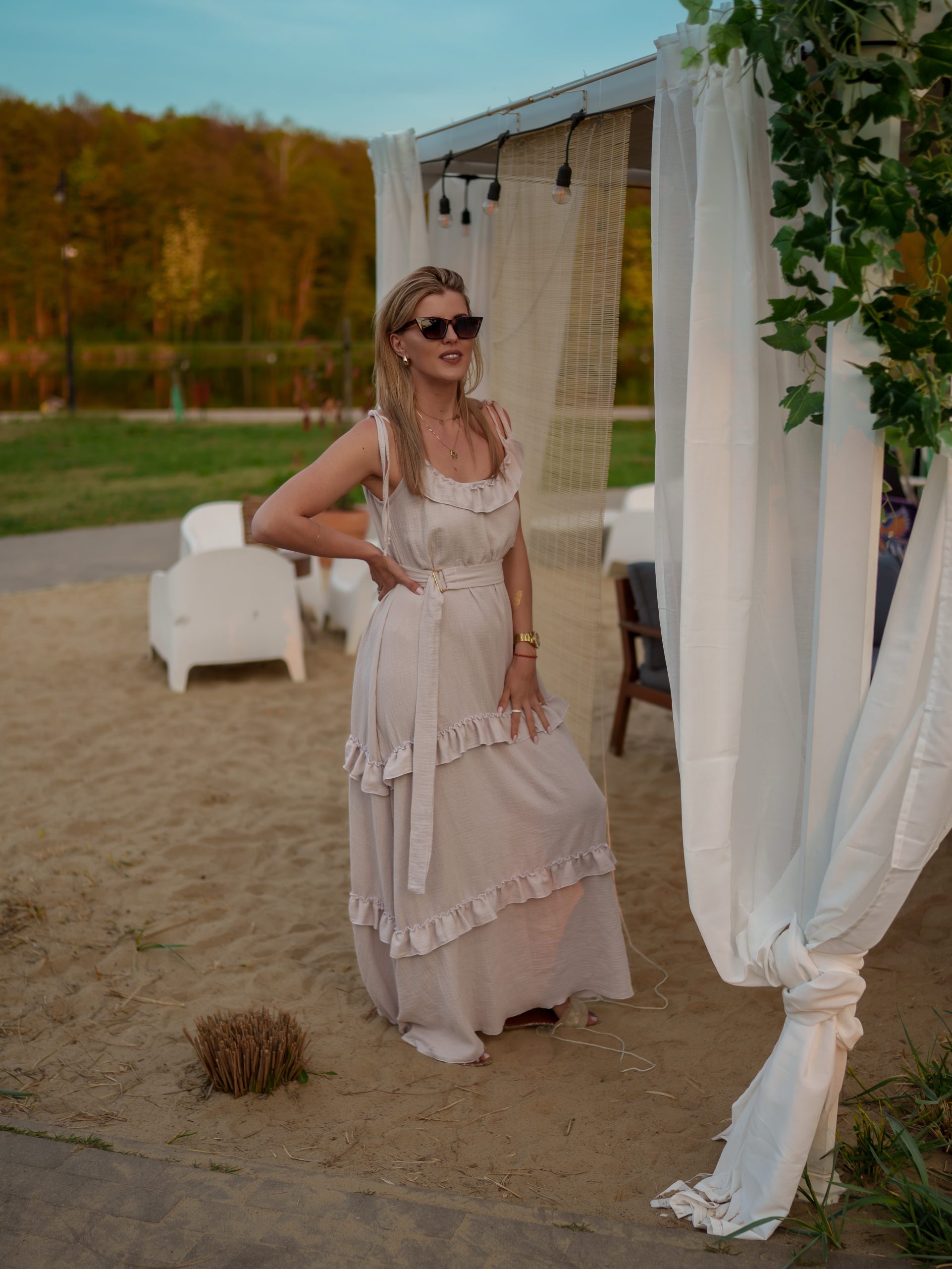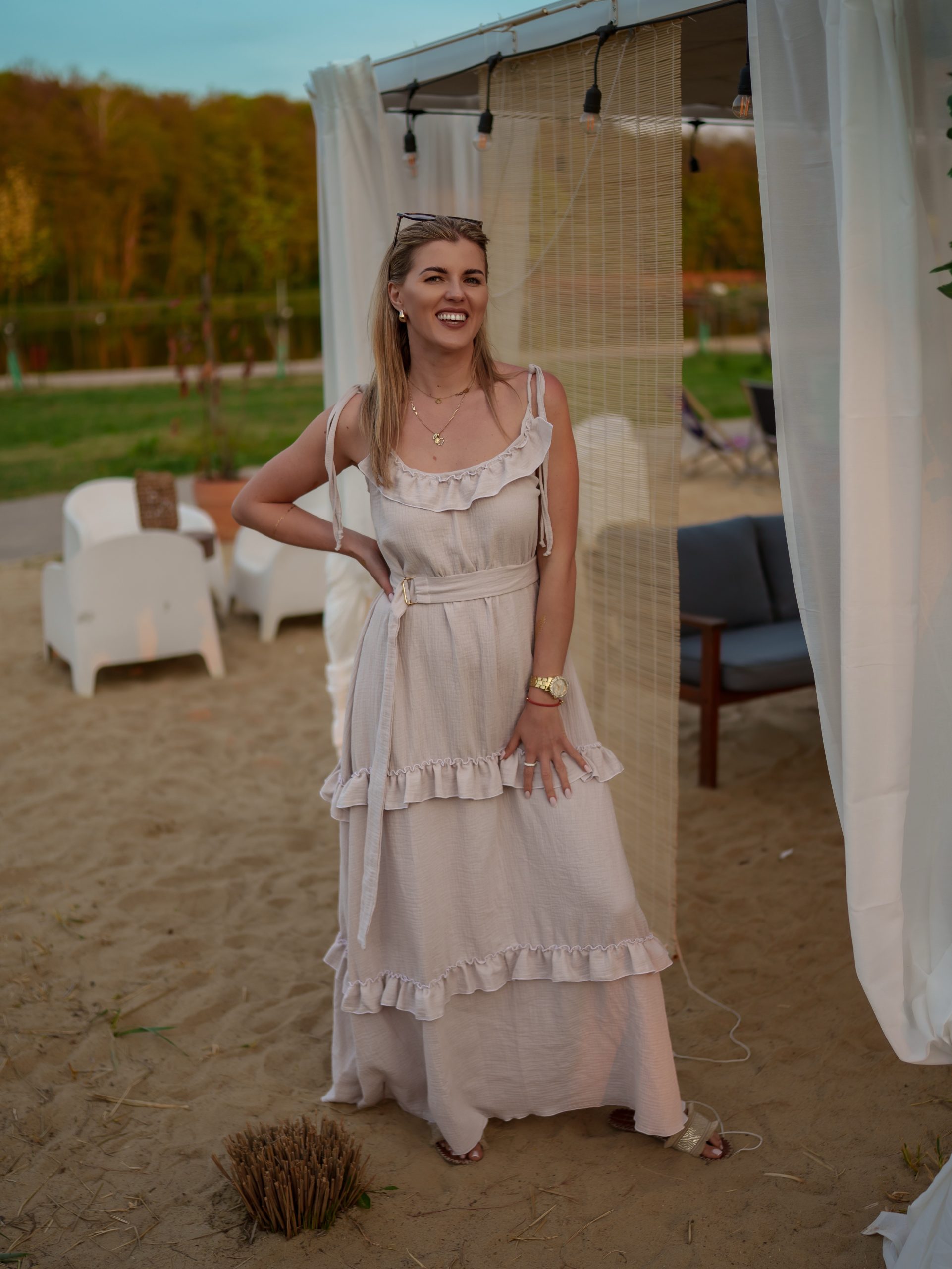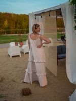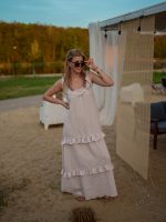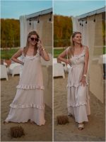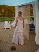 Strona główna Boho Maxi sukienka muślinowa oversize z trzema falbanami 2w1 z paskiem beżowy