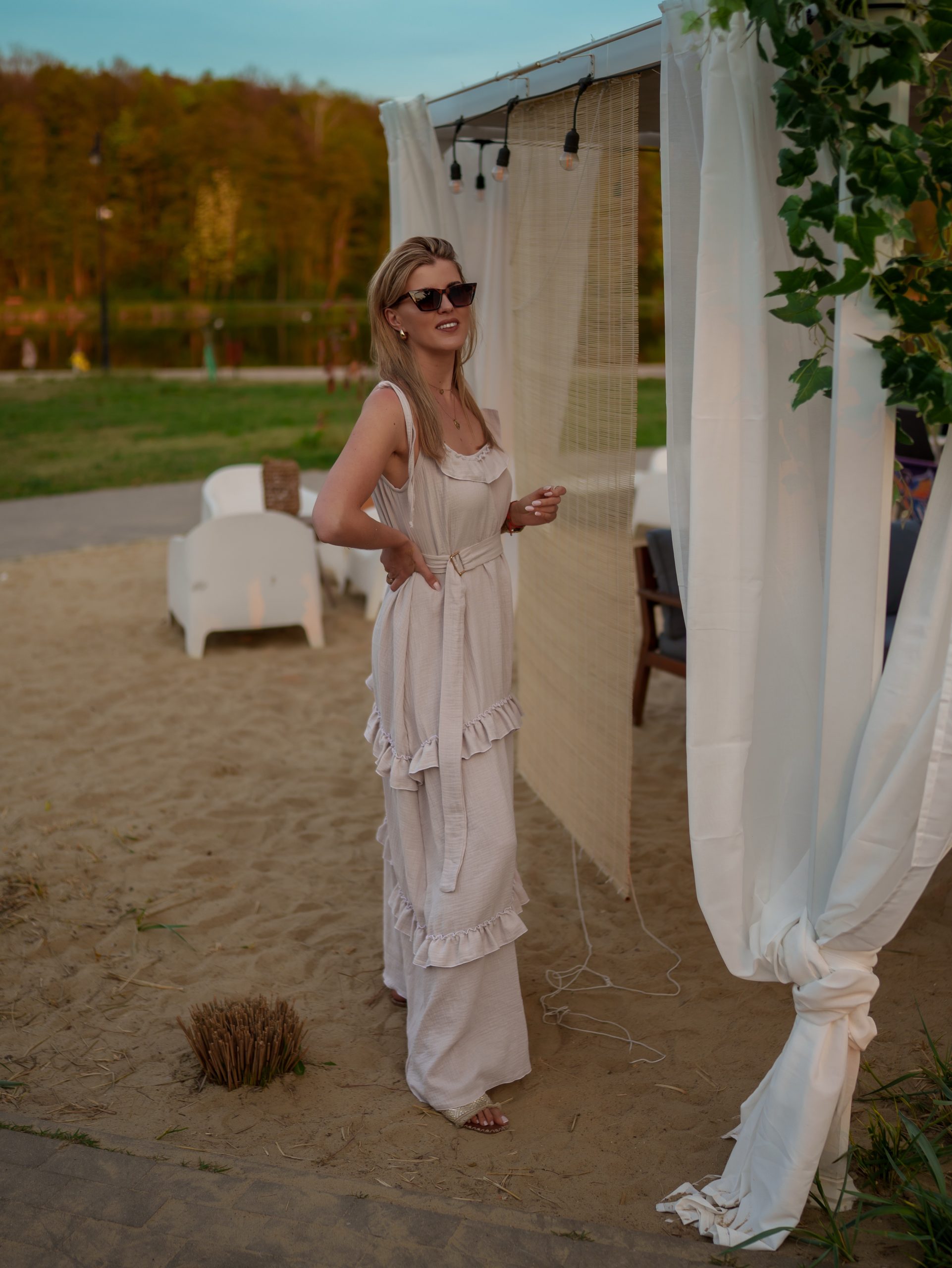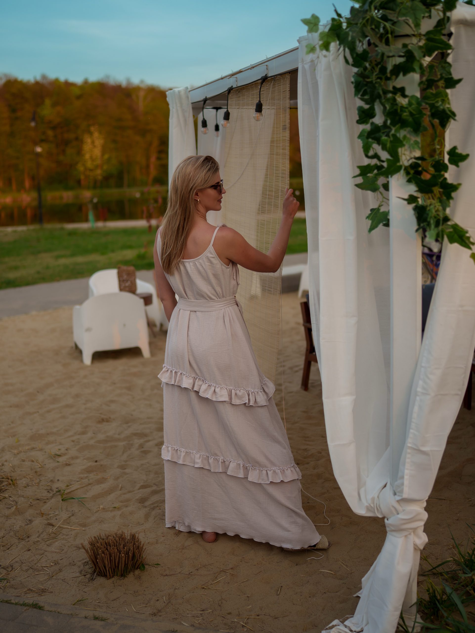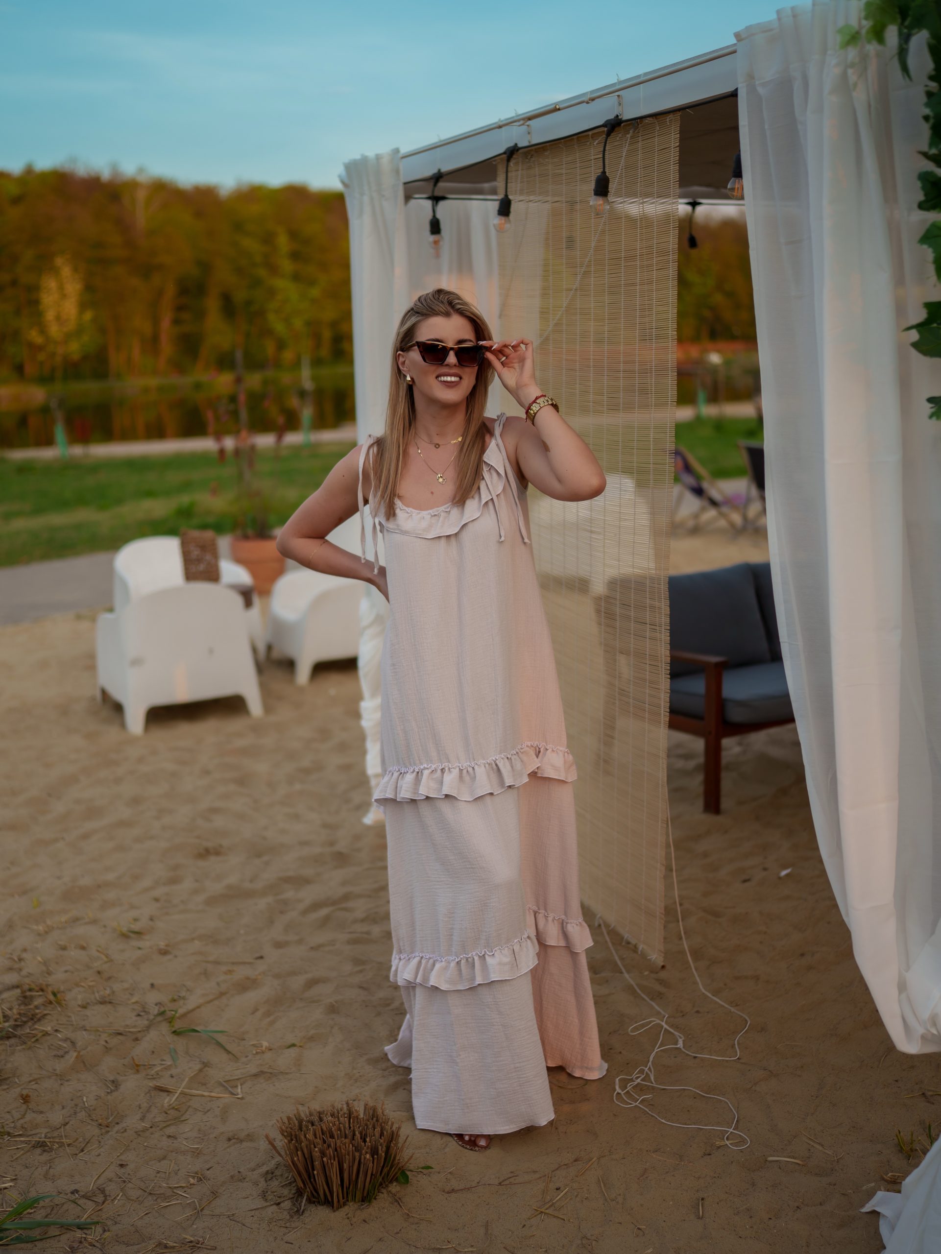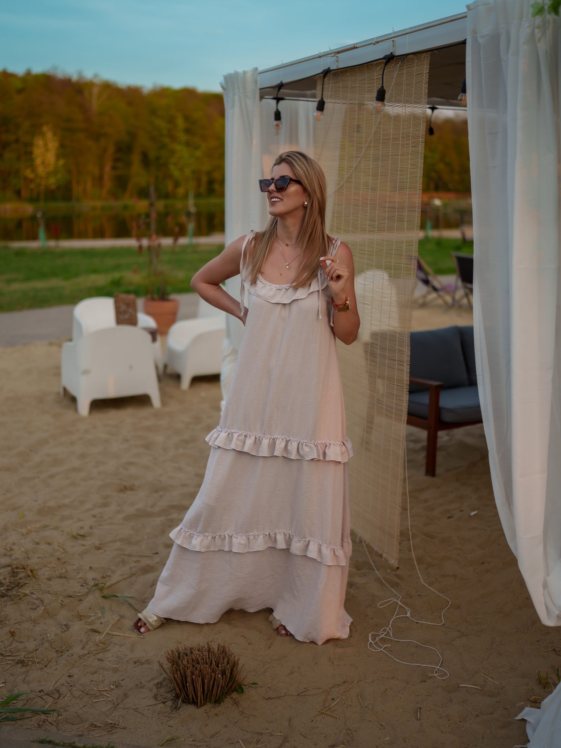 Strona główna Boho Maxi sukienka muślinowa oversize z trzema falbanami 2w1 z paskiem beżowy