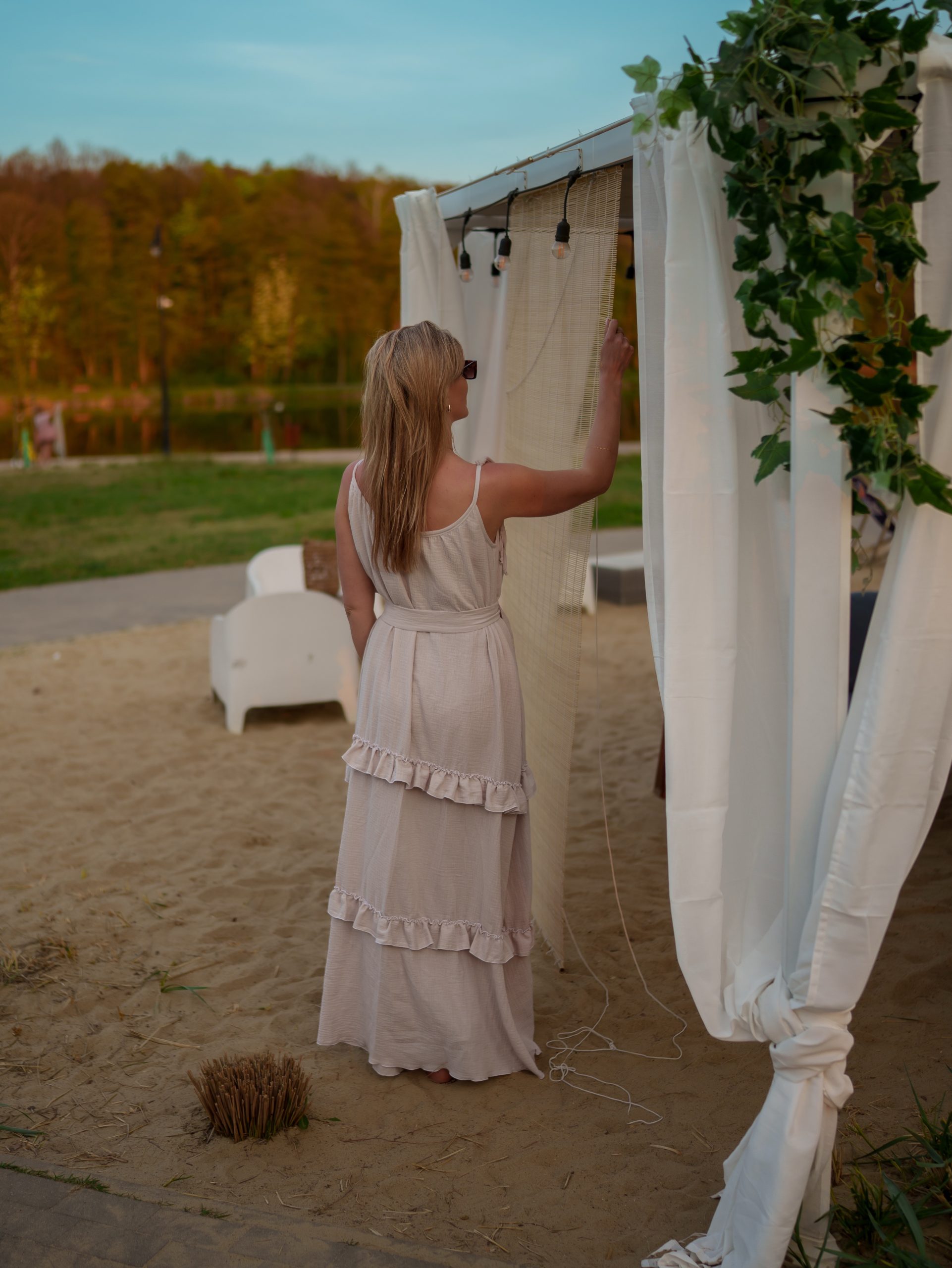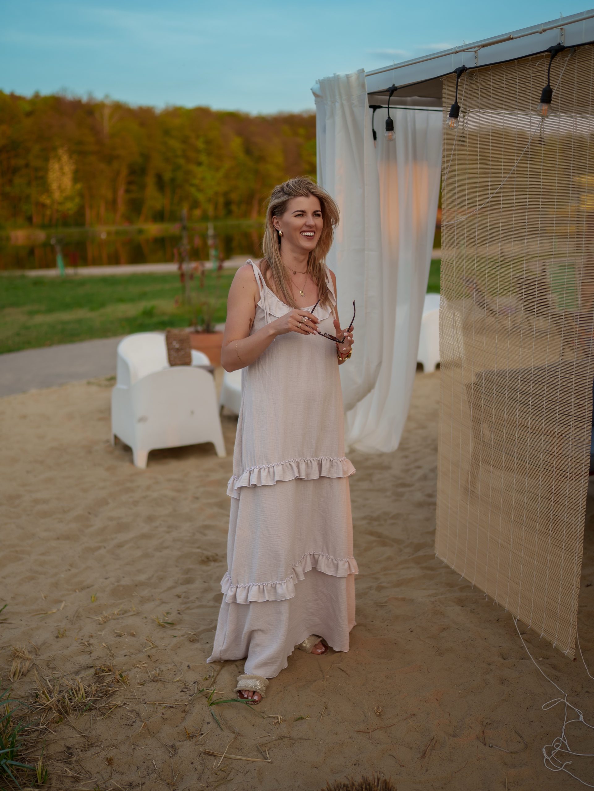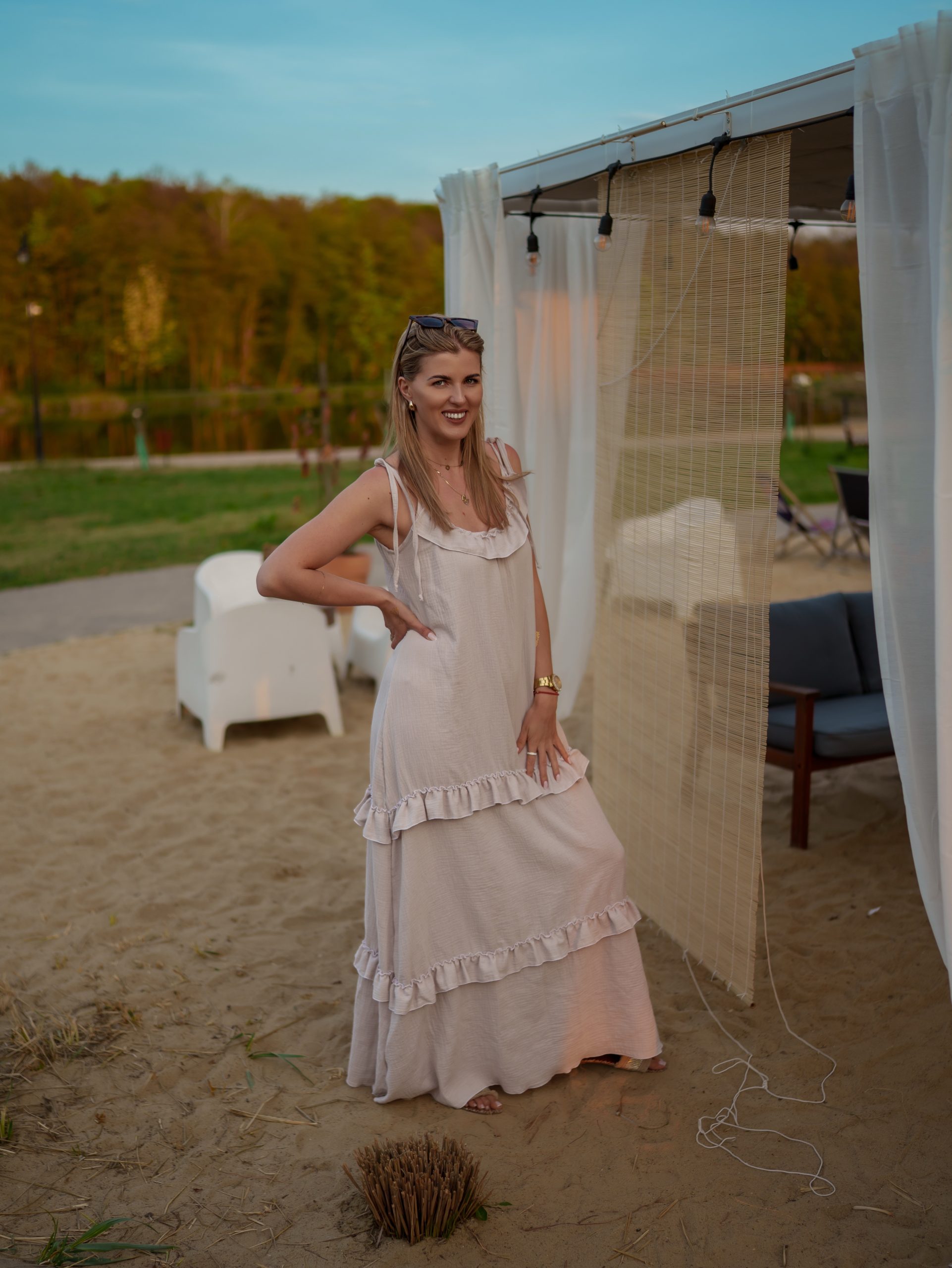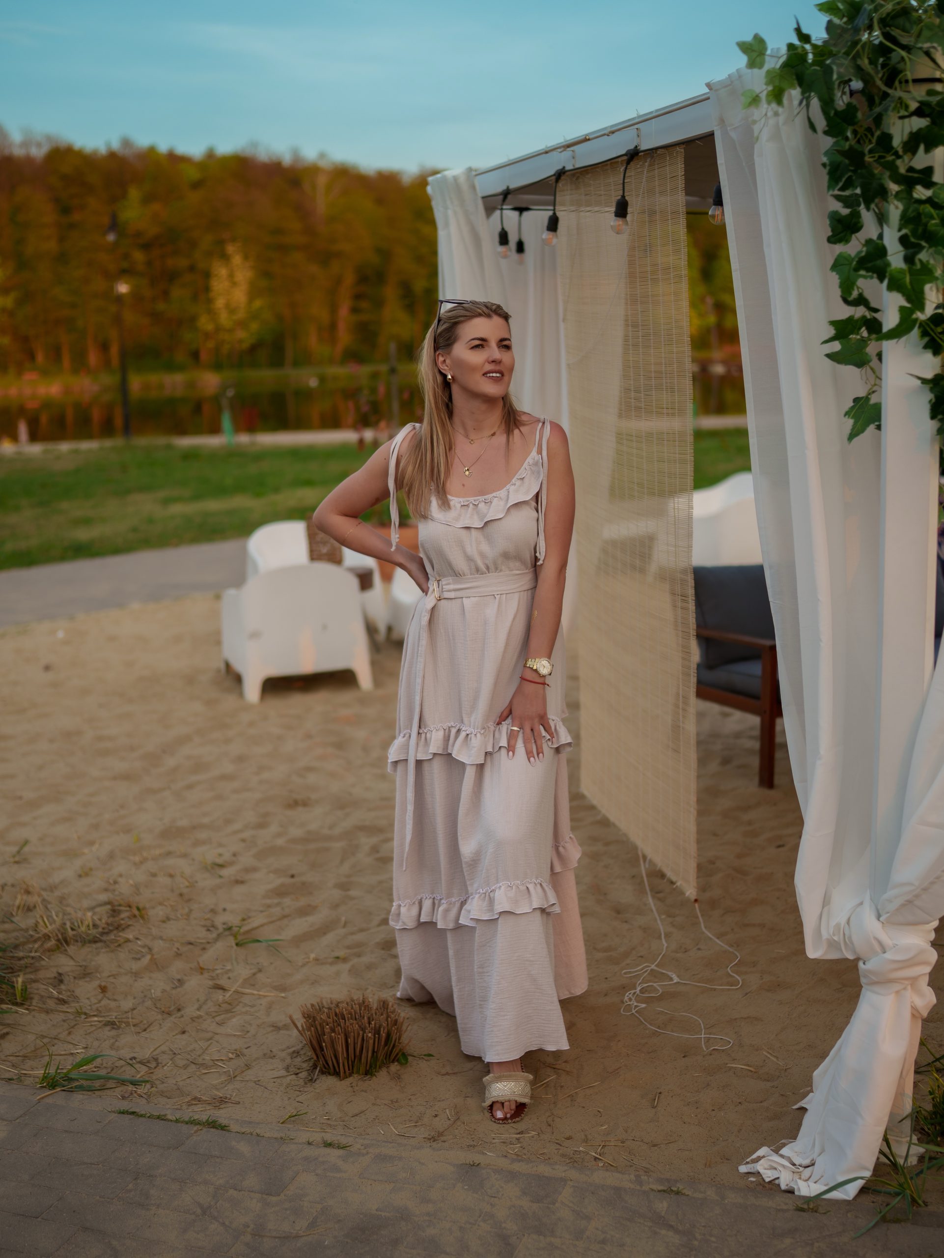 Strona główna Boho Maxi sukienka muślinowa oversize z trzema falbanami 2w1 z paskiem beżowy
