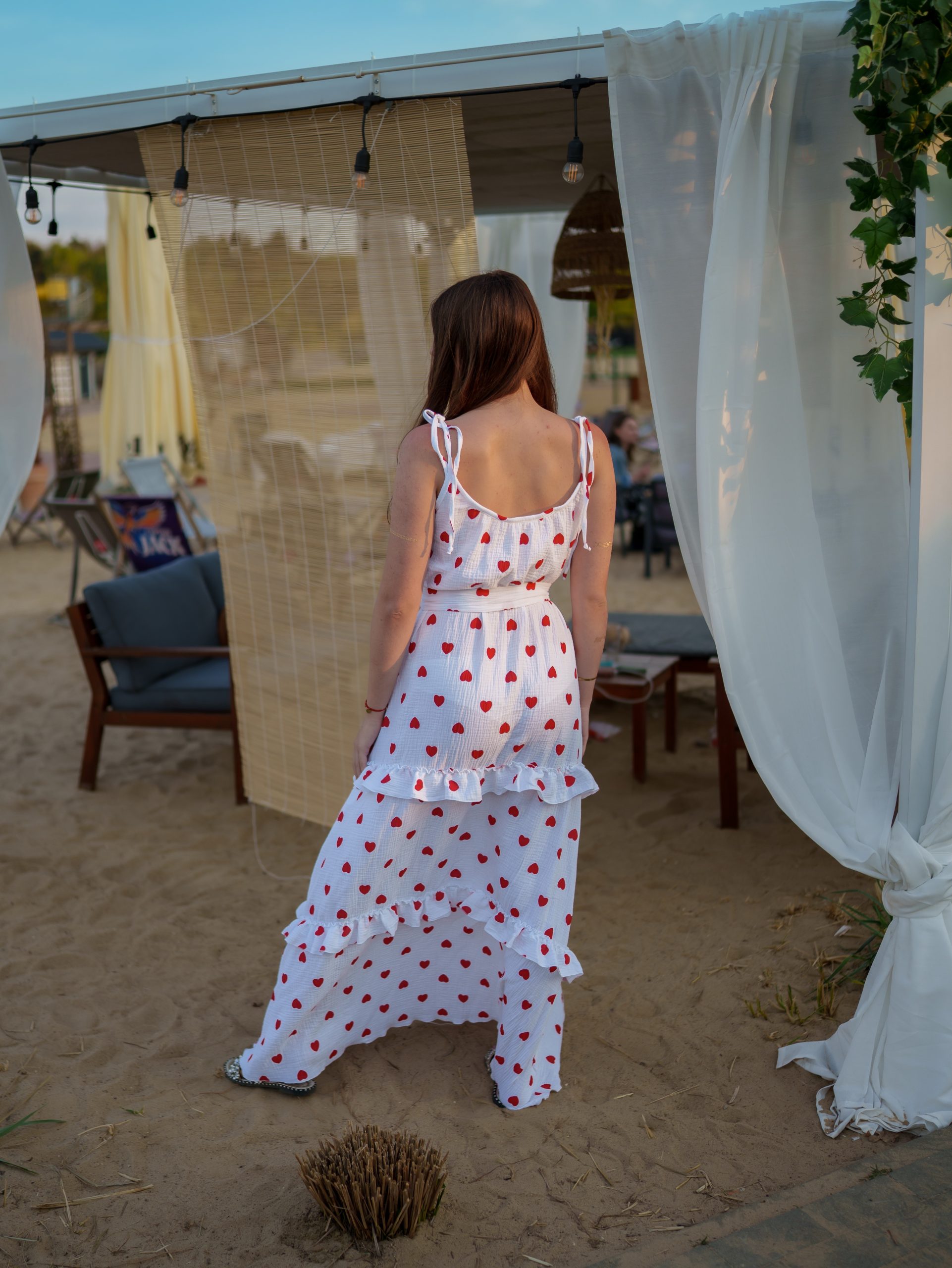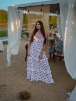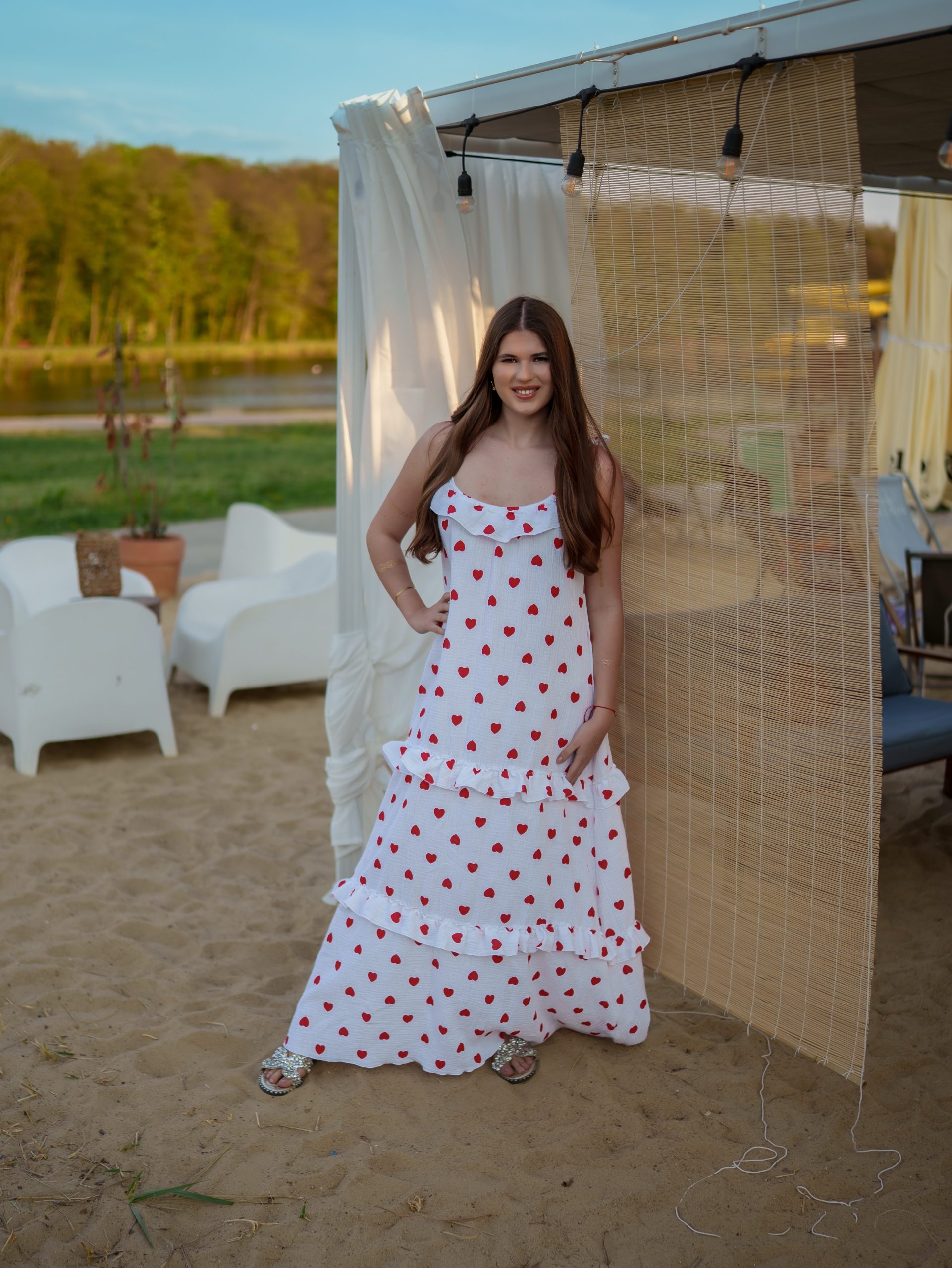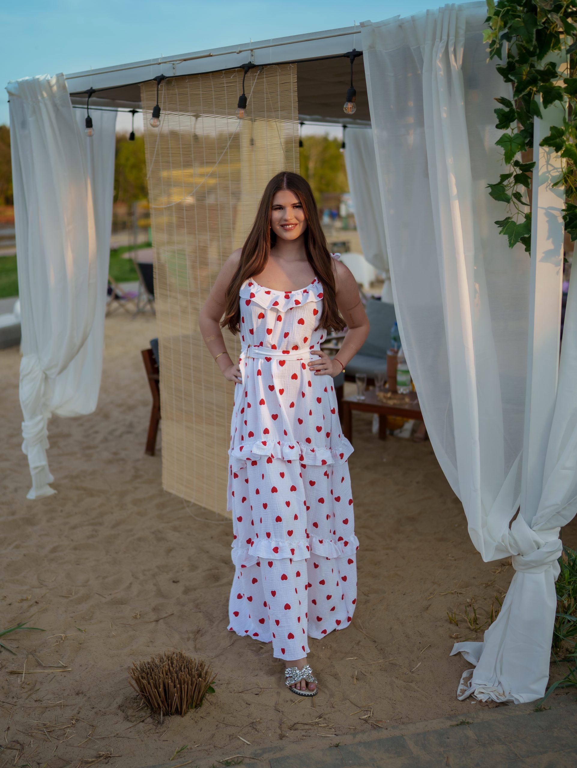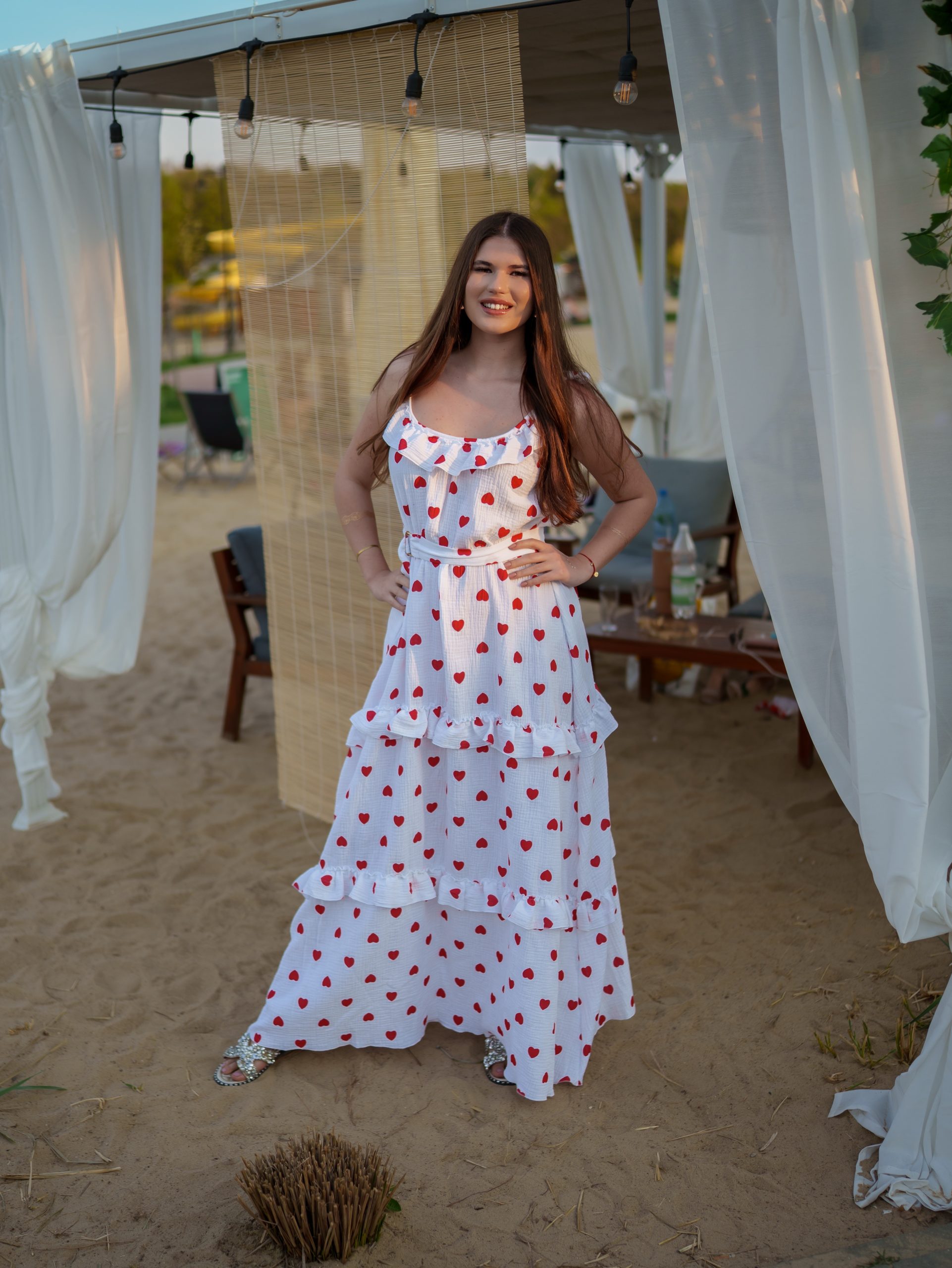 Strona główna Boho Maxi sukienka muślinowa oversize z trzema falbanami 2w1 z paskiem biały w serduszka