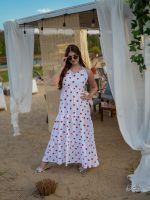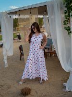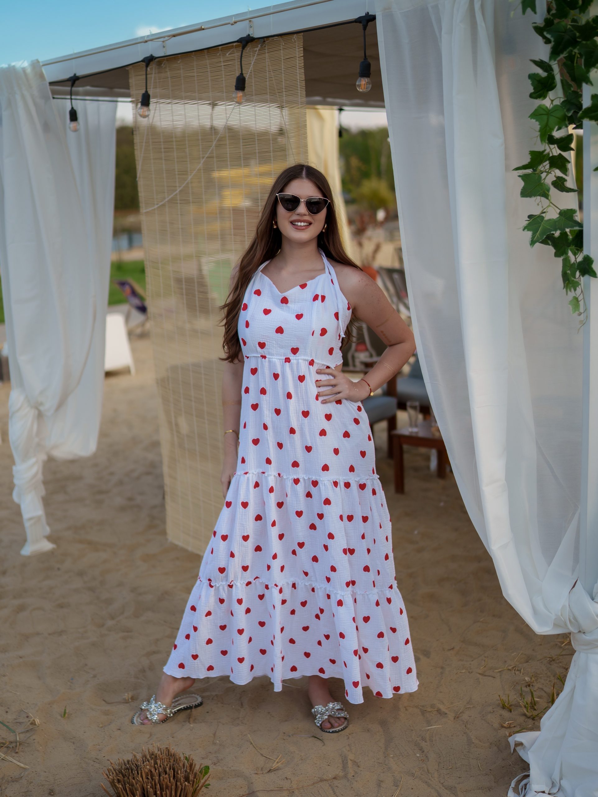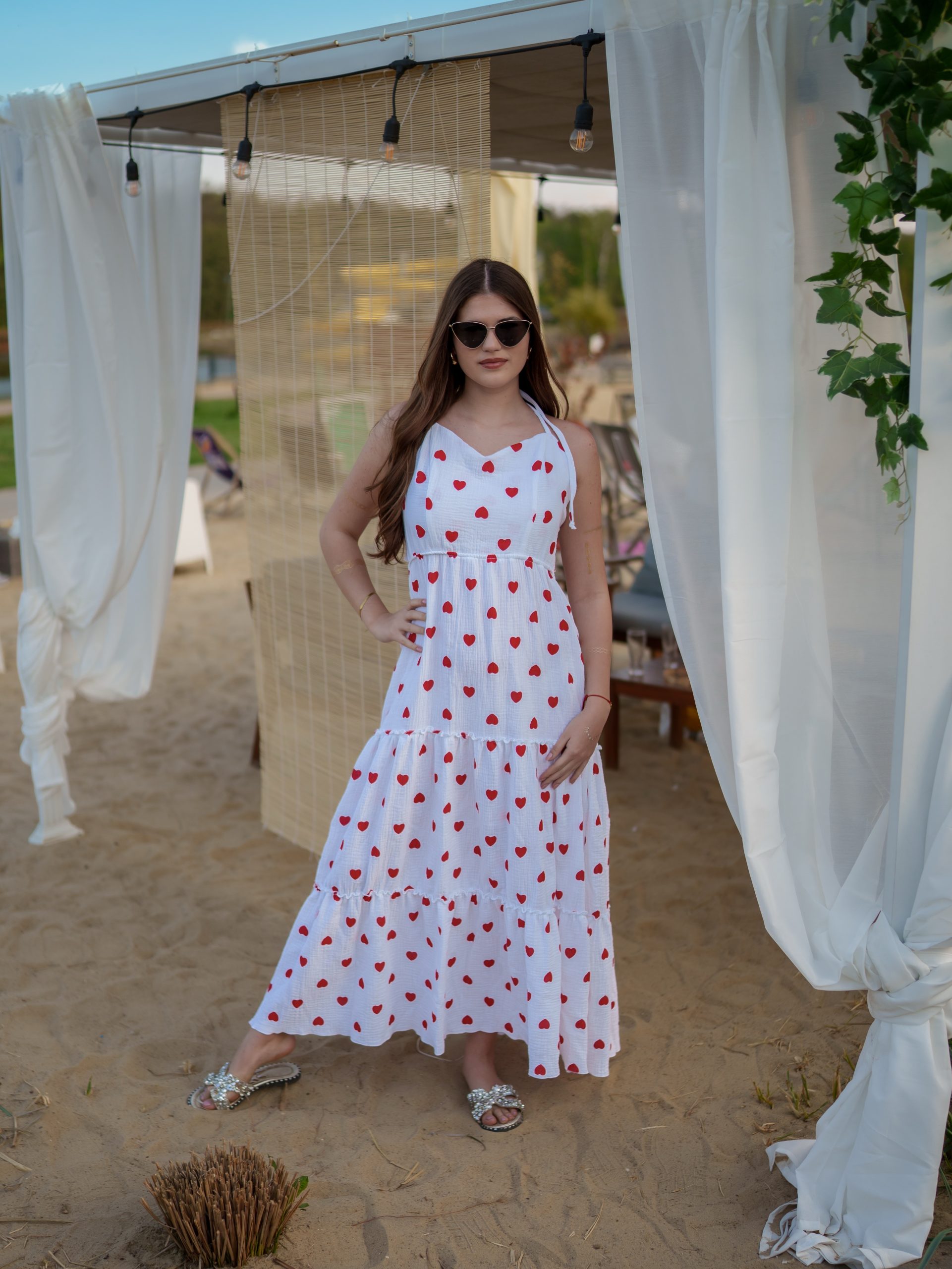 Strona główna Boho Muślinowa sukienka maxi z falbanami i gorsetową górą biały w serduszka