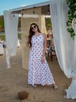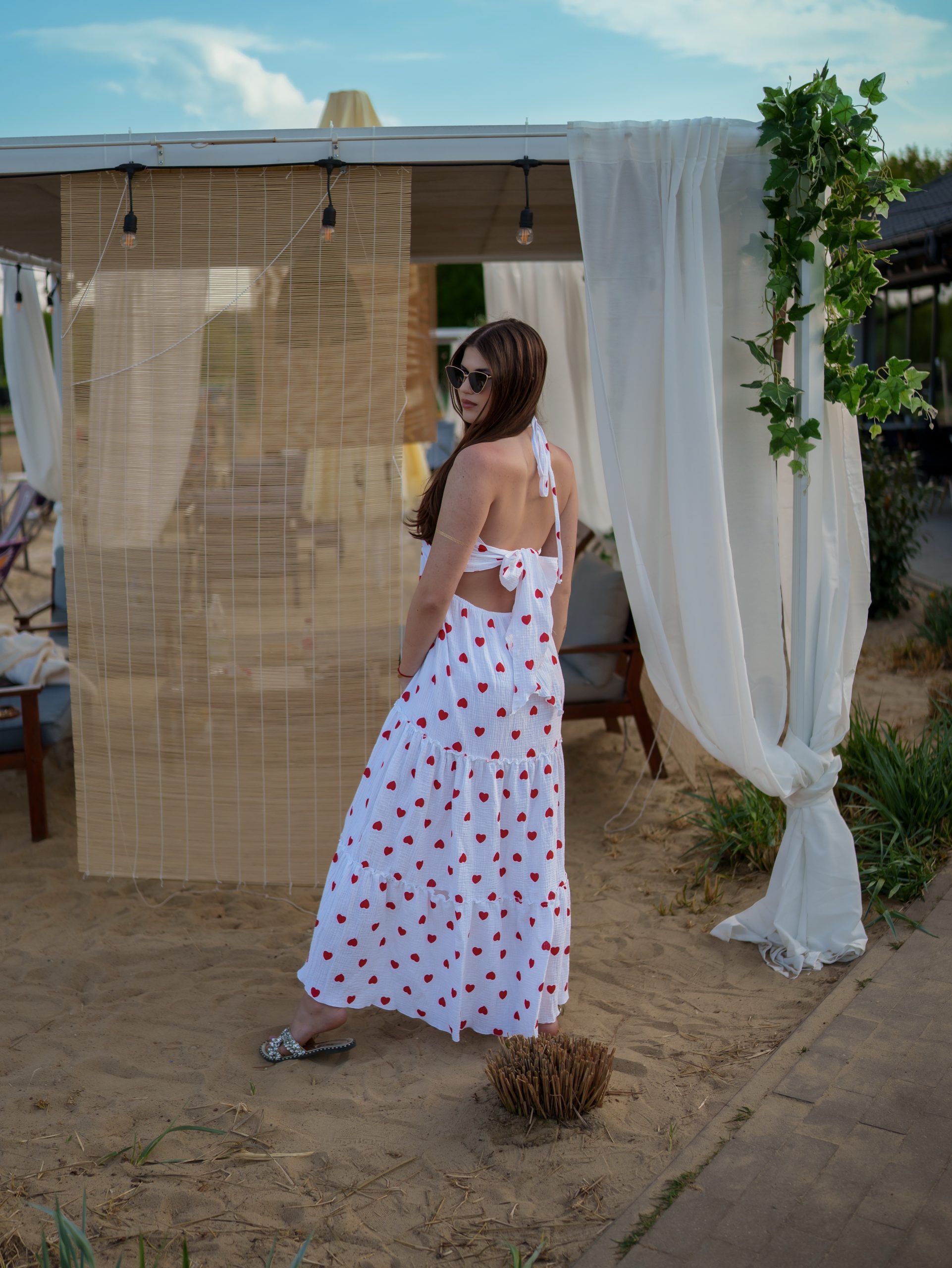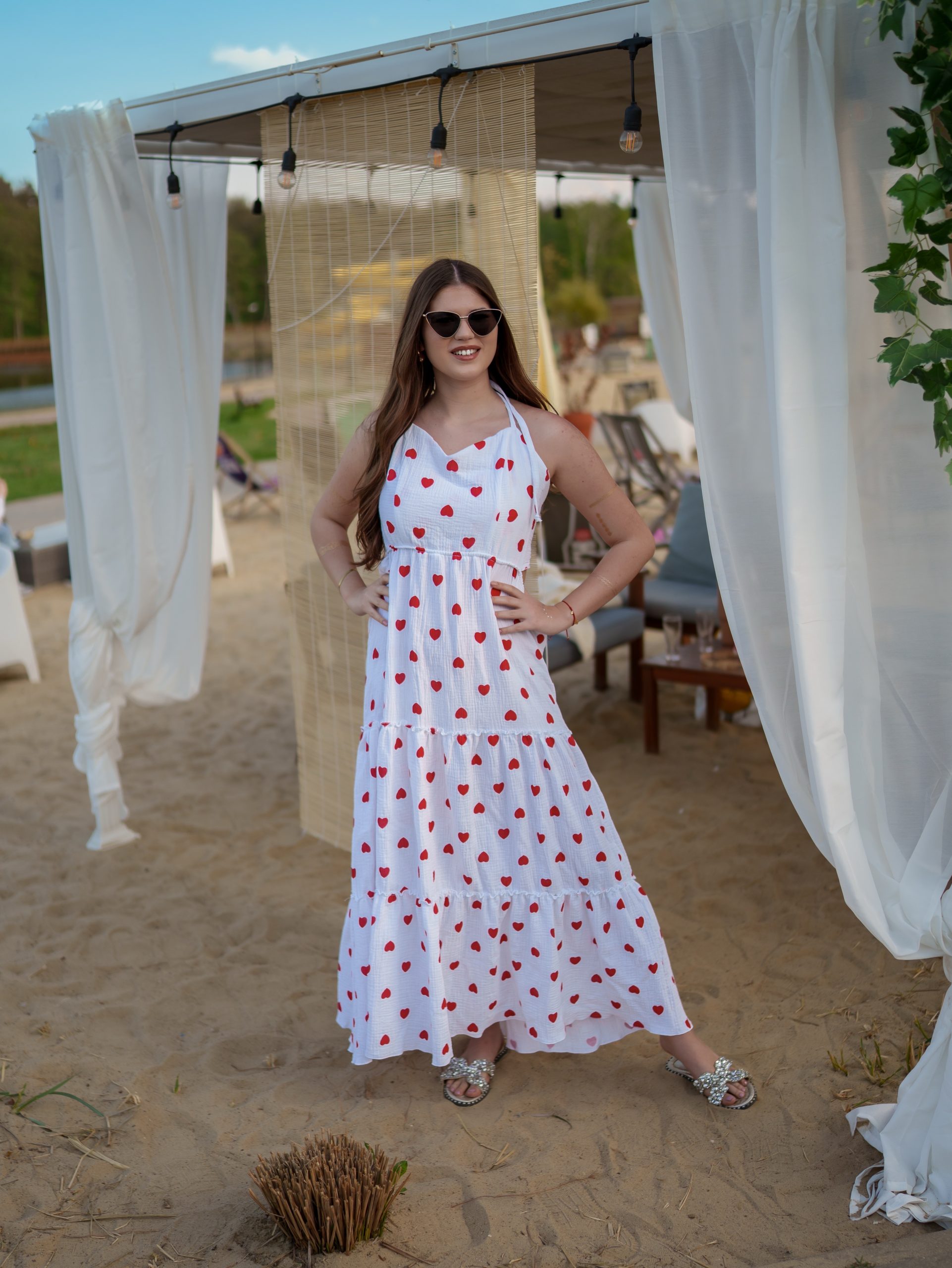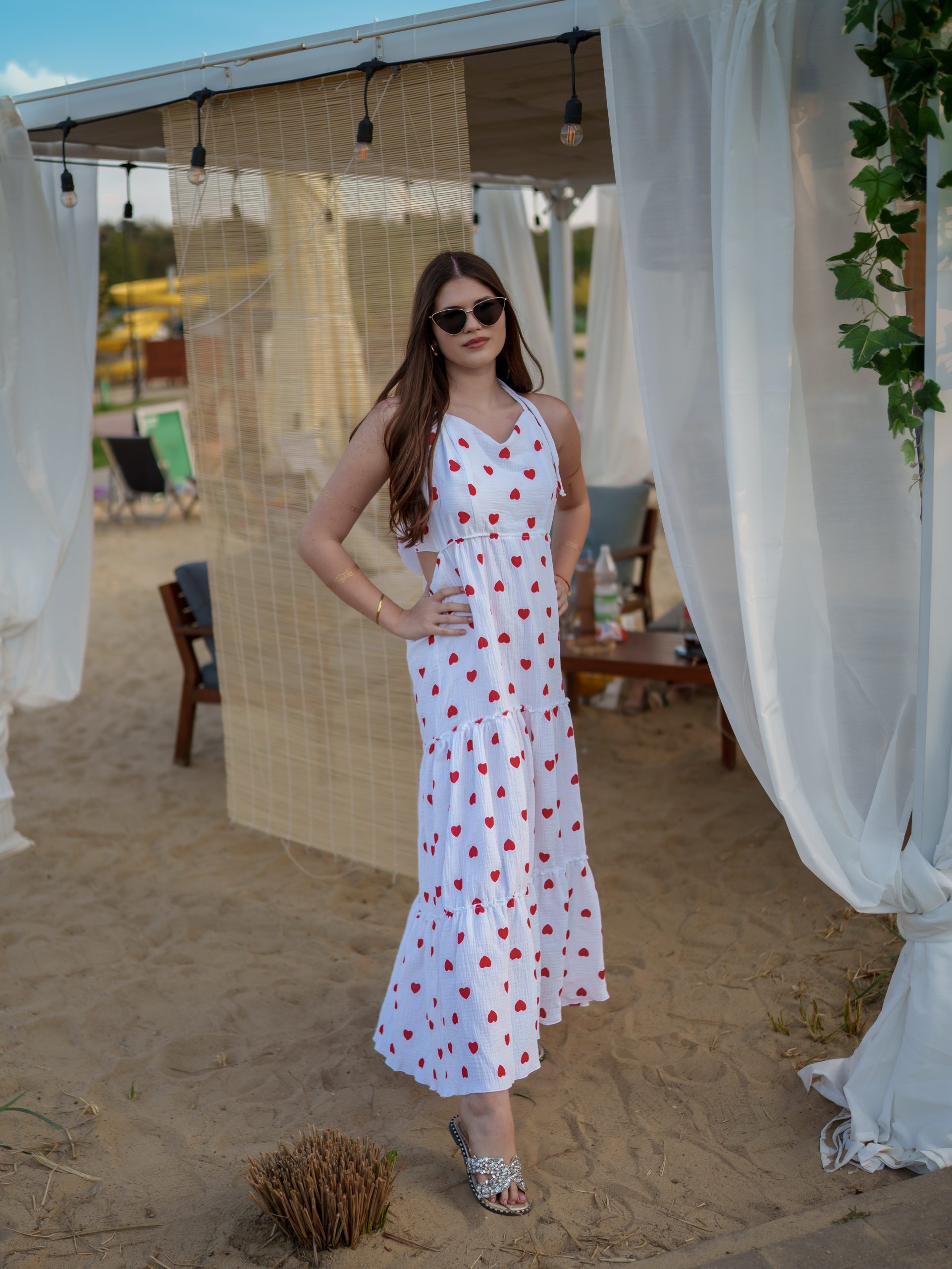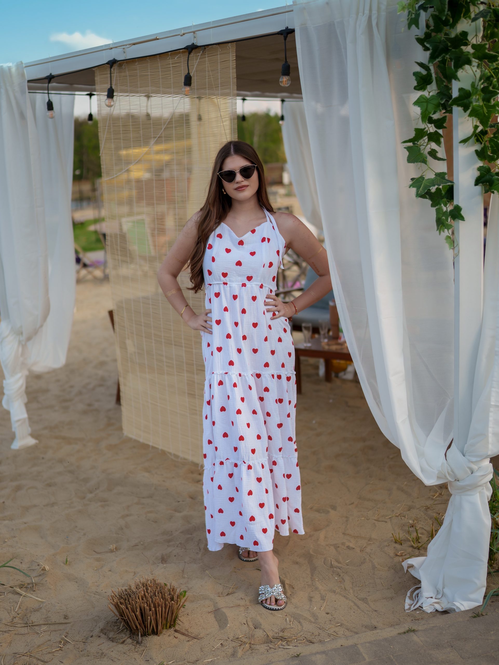 Muślinowa sukienka maxi z falbanami i gorsetową górą biały w serduszka