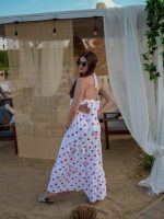 Gorsetowa góra pięknie modeluje sylwetkę, a regulowane ramiączka i ozdobna kokarda wiązana z tyłu pozwalają idealnie dopasować sukienkę do figury. Dolna część sukienki to trzy efektowne falbany, które tworzą szeroką, zwiewną spódnicę maxi – idealną na spacer po plaży, randkę, wakacyjny spacer po mieście czy letnie spotkanie przy grillu.