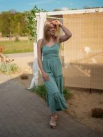 Muślinowa sukienka maxi z falbanami i gorsetową górą szałwiowy