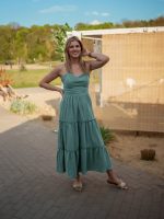 Gorsetowa góra pięknie modeluje sylwetkę, a regulowane ramiączka i ozdobna kokarda wiązana z tyłu pozwalają idealnie dopasować sukienkę do figury. Dolna część sukienki to trzy efektowne falbany, które tworzą szeroką, zwiewną spódnicę maxi – idealną na spacer po plaży, randkę, wakacyjny spacer po mieście czy letnie spotkanie przy grillu.