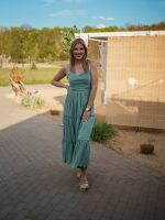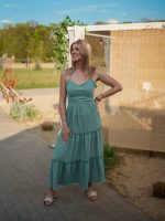 Szukasz sukienki, która będzie zarówno wygodna, jak i efektowna? Muślinowa sukienka maxi z gorsetową górą i falbanami to idealny wybór na lato! Wykonana w 100% z oddychającego muślinu (bawełna), zapewnia lekkość, przewiewność i komfort noszenia nawet w największe upały.