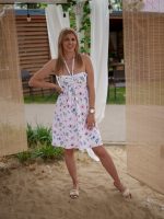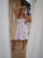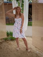 Ta letnia sukienka przed kolano wyróżnia się subtelnym krojem i kobiecymi detalami. Z tyłu efektownie wiązana na ozdobną kokardę, która nadaje całości romantycznego charakteru. Z przodu znajdują się dwa dekoracyjne sznureczki, które dodają lekkości i niepowtarzalnego uroku.