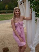 Ta letnia sukienka przed kolano wyróżnia się subtelnym krojem i kobiecymi detalami. Z tyłu efektownie wiązana na ozdobną kokardę, która nadaje całości romantycznego charakteru. Z przodu znajdują się dwa dekoracyjne sznureczki, które dodają lekkości i niepowtarzalnego uroku.