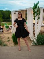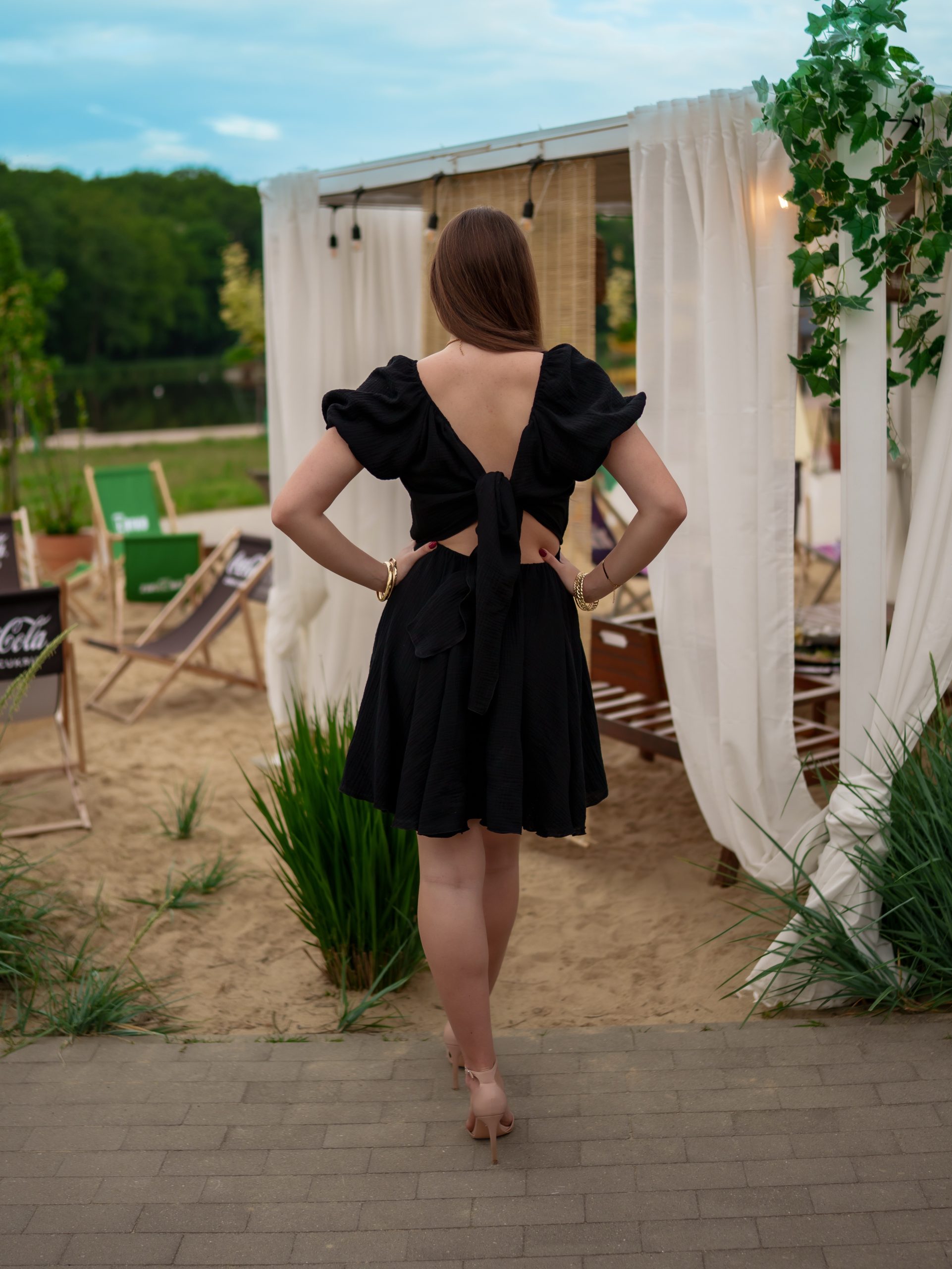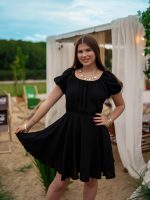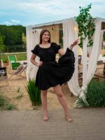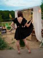Fason odcinany pod biustem podkreśla sylwetkę i optycznie ją wydłuża, a krótki rękawek można nosić klasycznie lub opuścić na ramiona, tworząc efekt hiszpanki. Tył sukienki to prawdziwy detal wow – wiązanie umożliwia dopasowanie i jednocześnie tworzy ozdobną kokardę, która przyciąga spojrzenia.