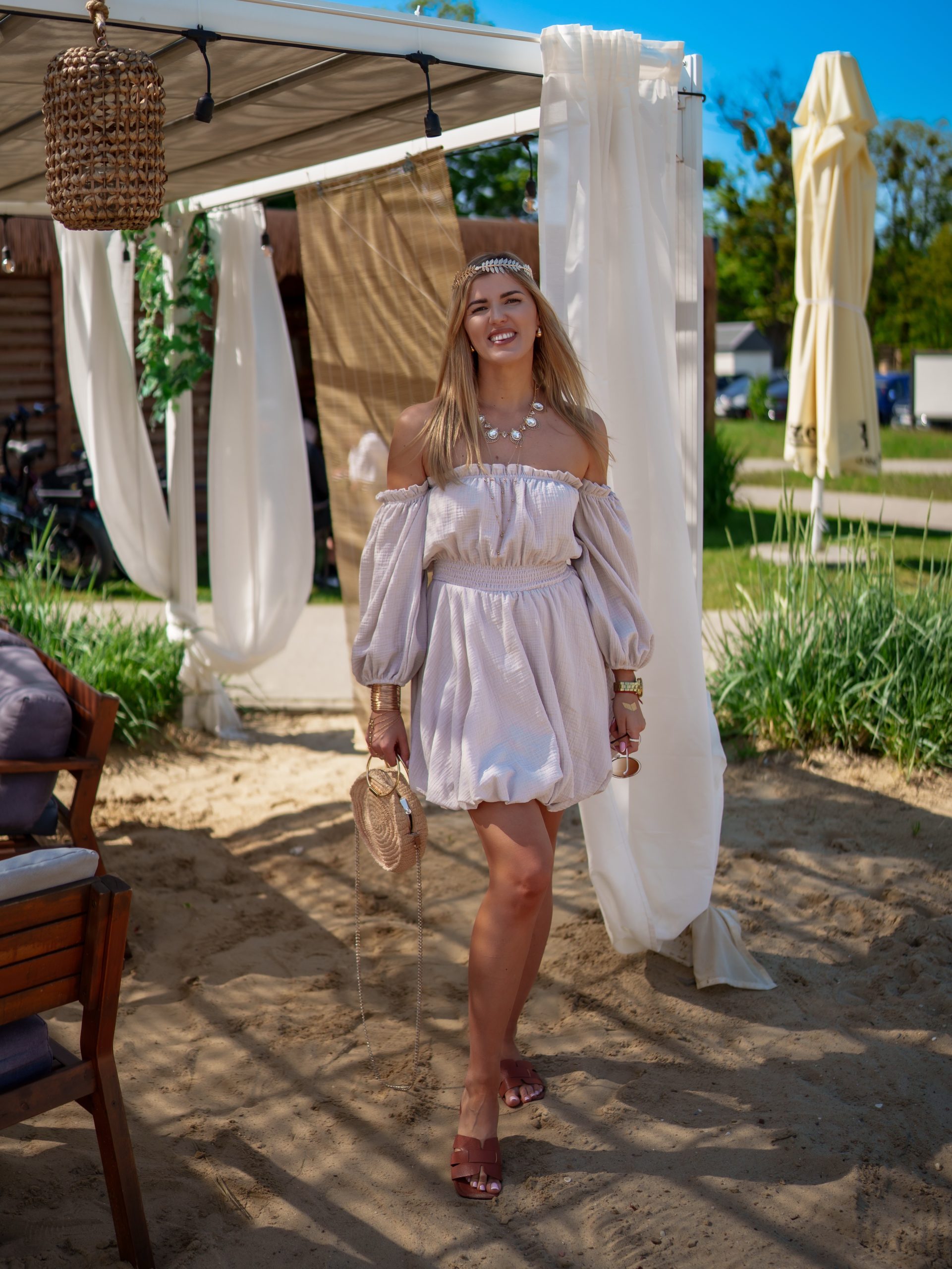 Strona główna Boho Sukienka muślinowa w kroju bombki z bufiastymi rękawami beżowy
