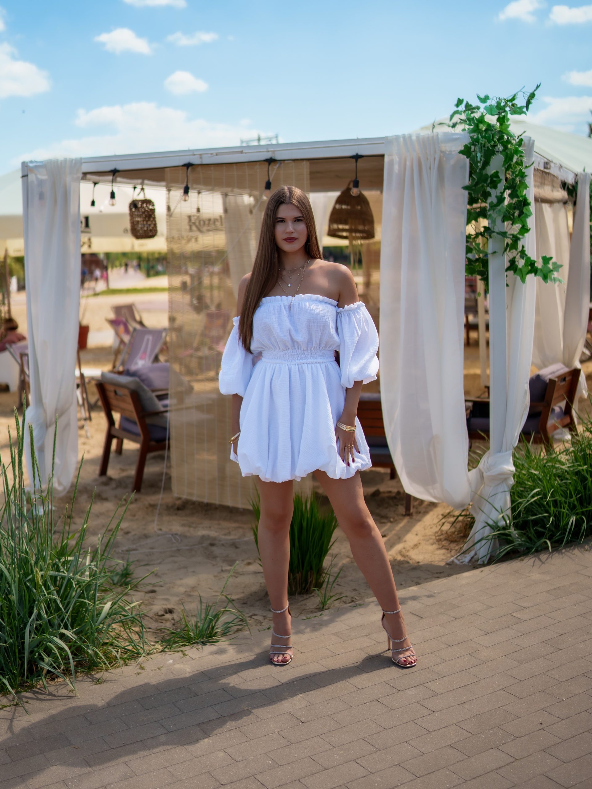 Sukienka muślinowa w kroju bombki z bufiastymi rękawami biały