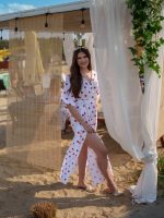 Sukienka muślinowa z dwoma rozcięciami i kimonowym dekoltem biała w kwiaty