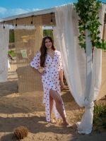 Model wyróżnia się kimonowym dekoltem w serek, który pięknie podkreśla linię ramion i szyi, a także dwoma seksownymi rozcięciami po bokach, które subtelnie eksponują nogi i dodają lekkości każdemu krokowi. Sukienka doskonale sprawdzi się zarówno jako stylowa plażowa sukienka, jak i element casualowej stylizacji na miasto, grilla czy letnie spotkanie z przyjaciółmi.