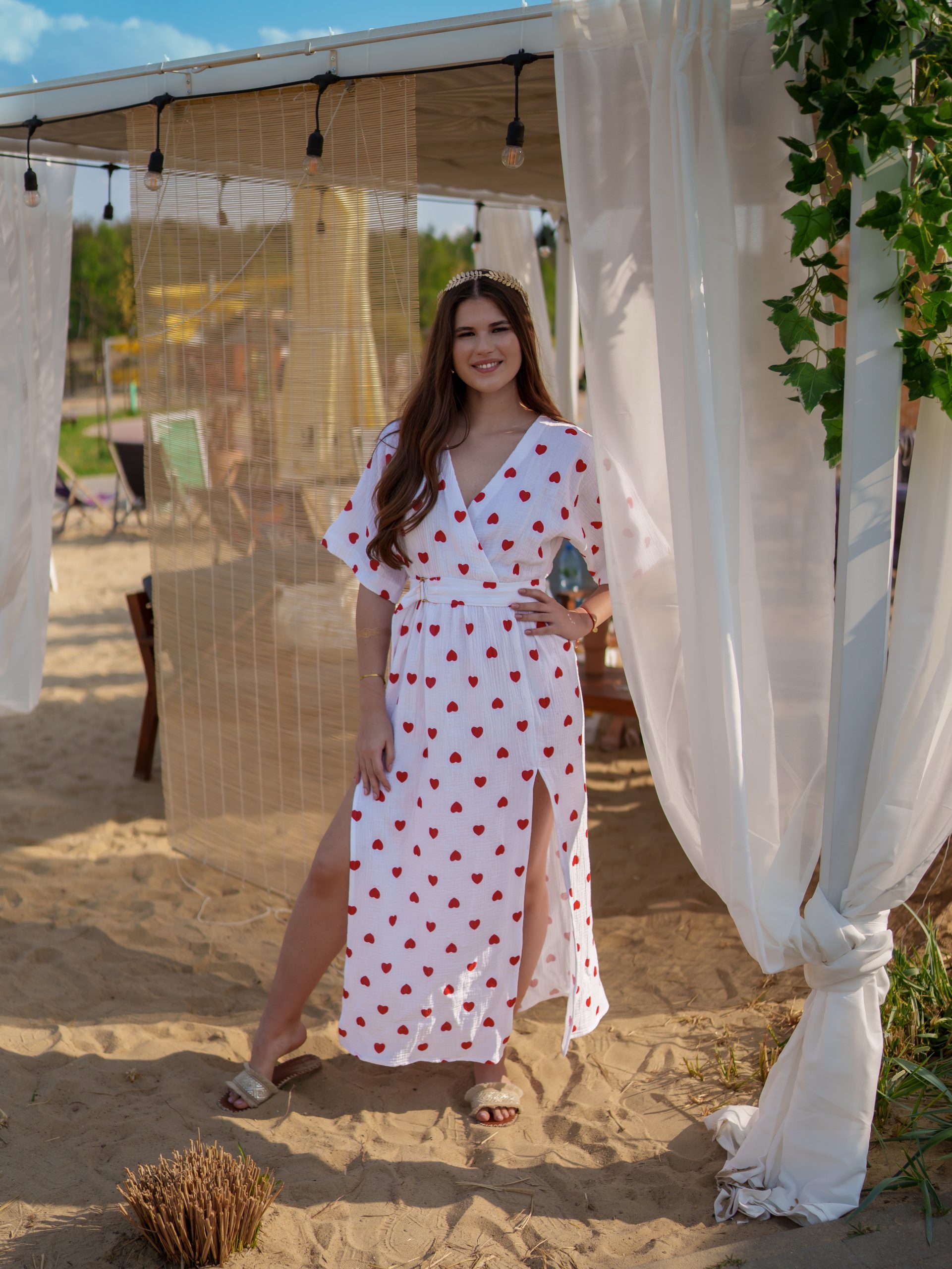 Sukienka muślinowa z dwoma rozcięciami i kimonowym dekoltem biała w serduszka