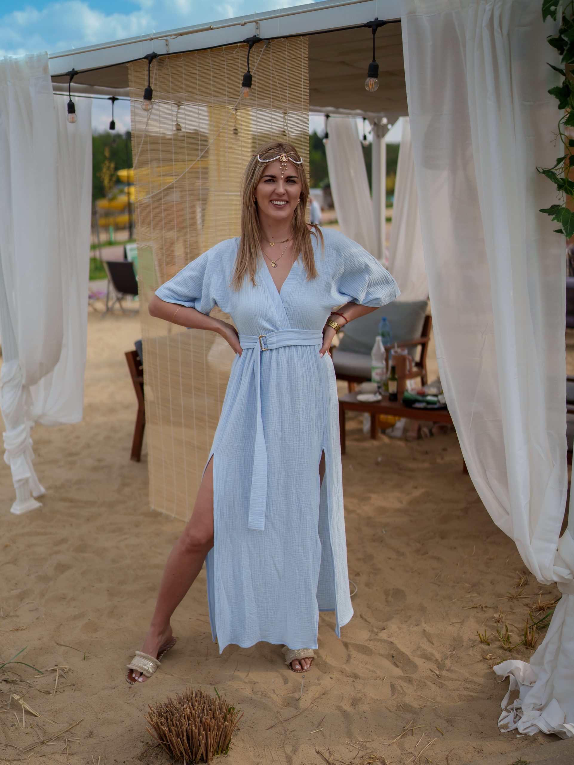 Sukienka muślinowa maxi „Bali” z ręcznie plecionymi warkoczami i rozporkiem błękitna