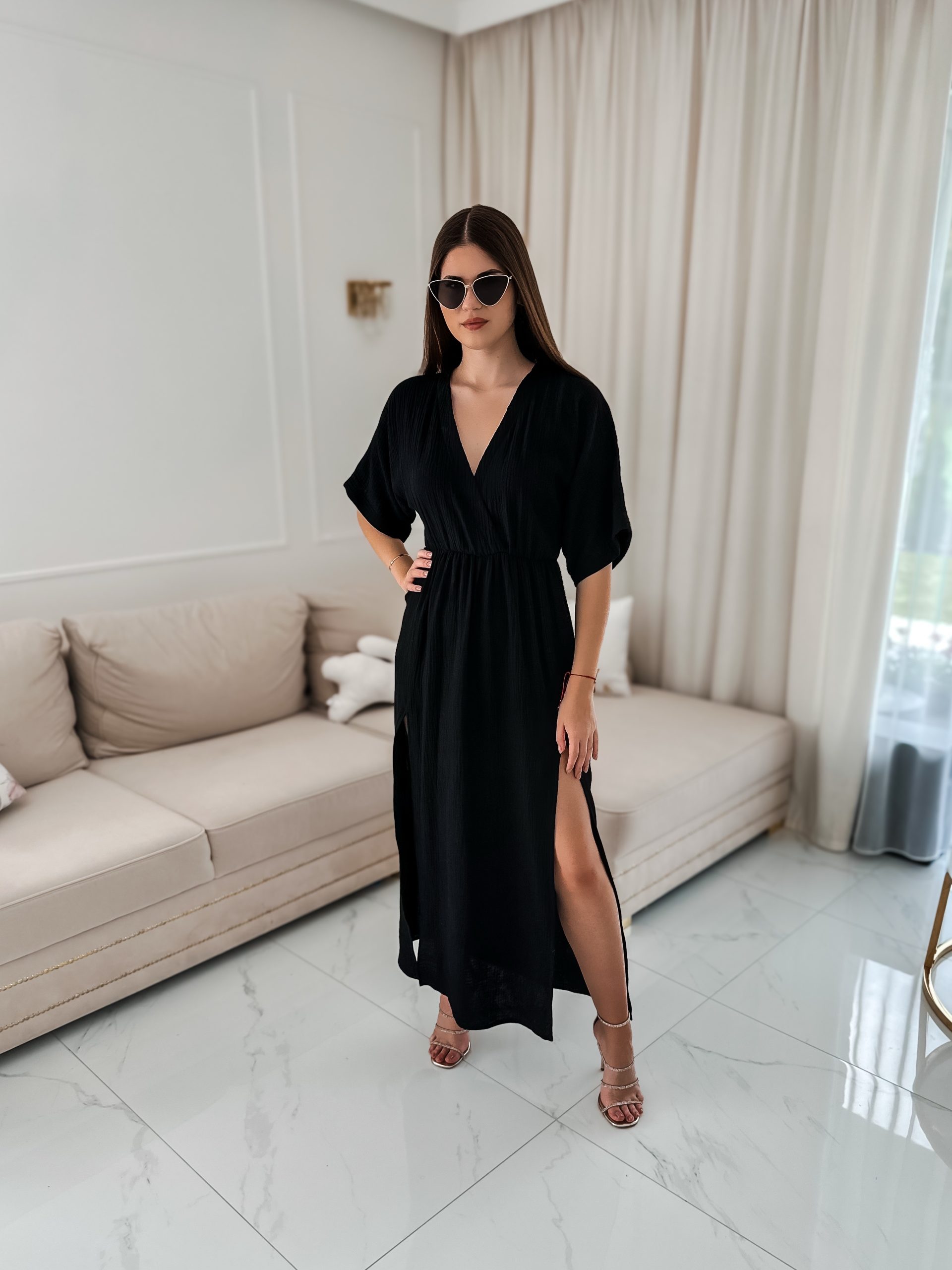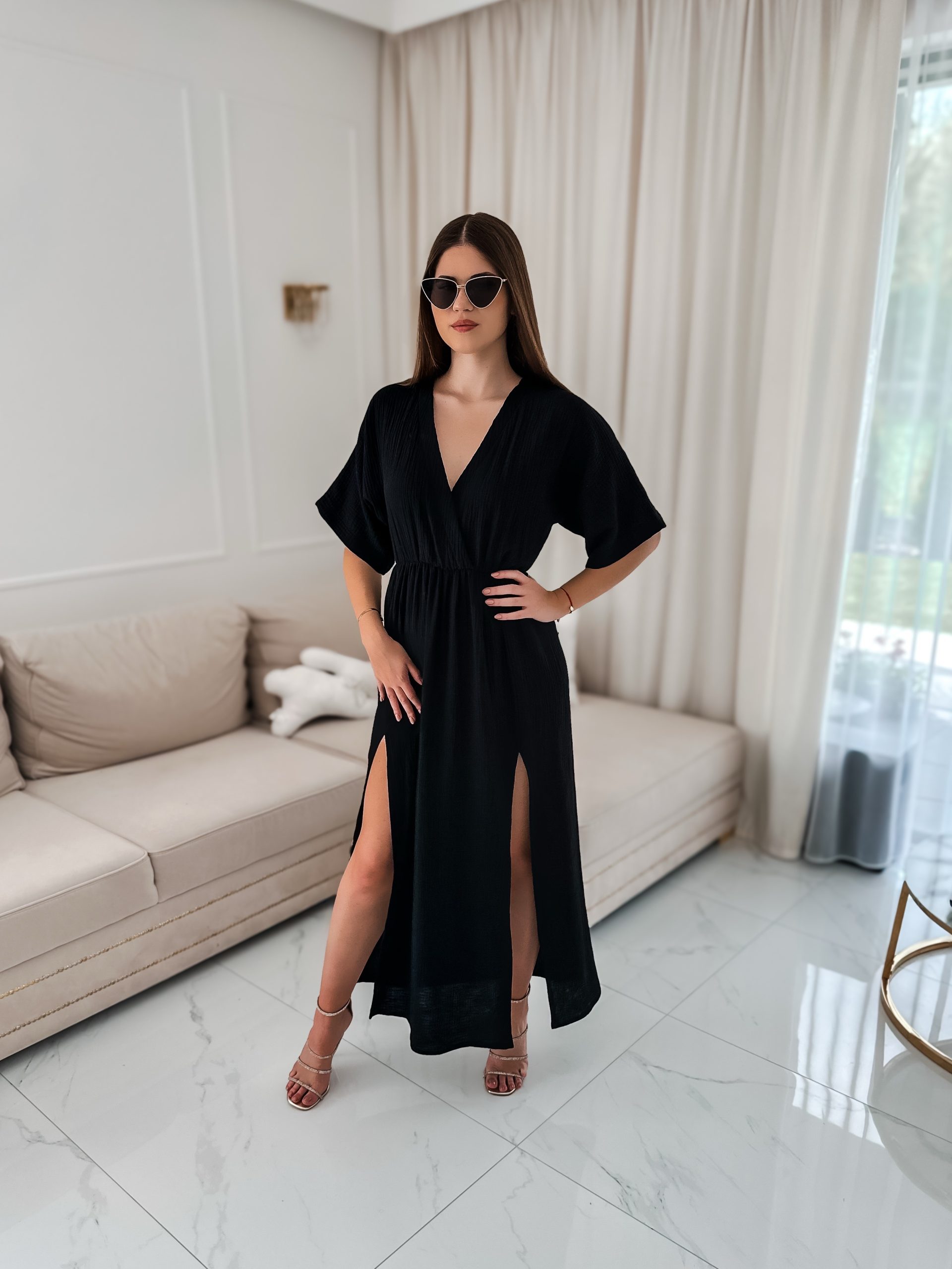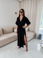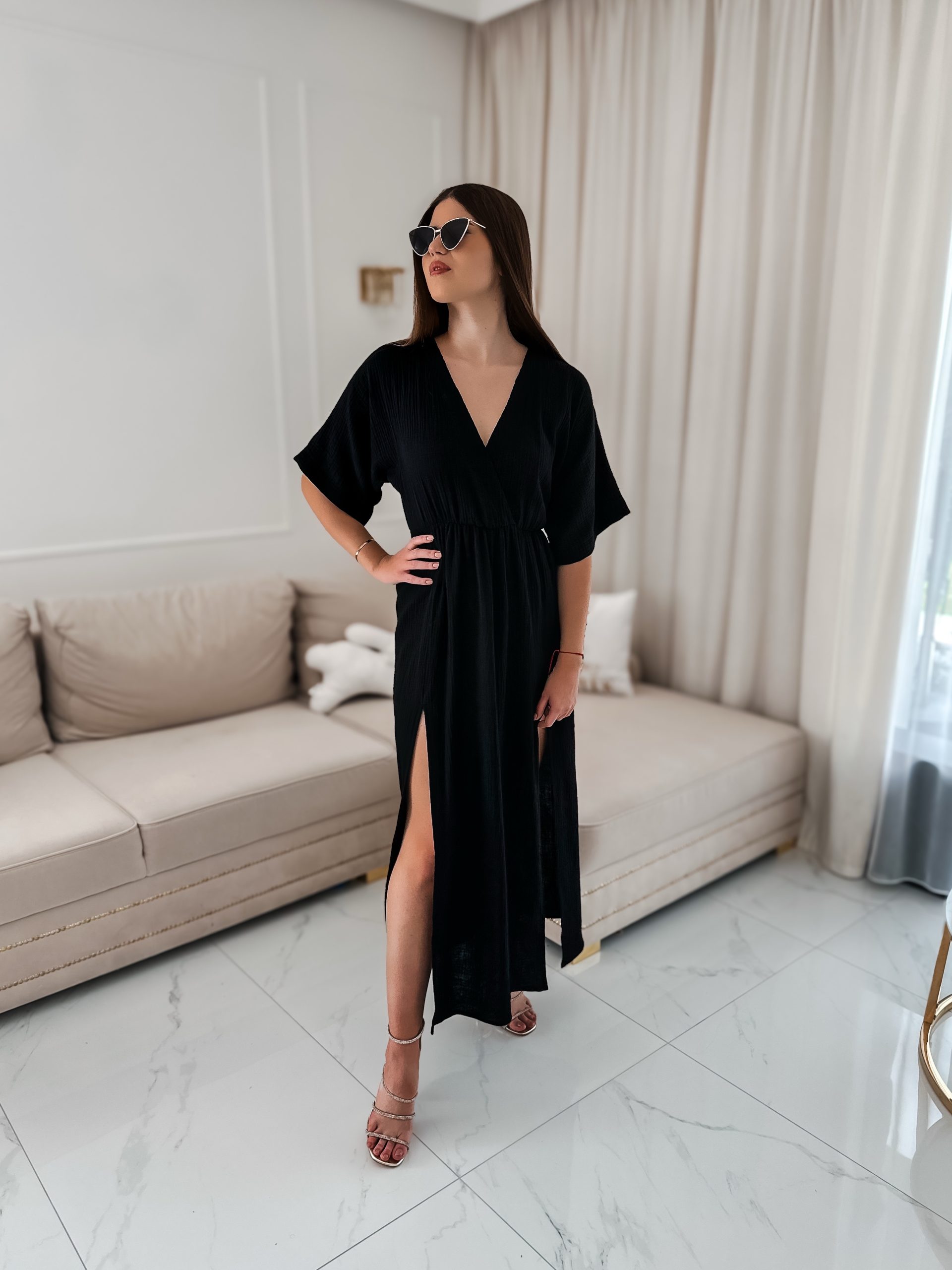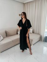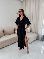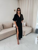 Sukienka muślinowa z dwoma rozcięciami i kimonowym dekoltem czarny