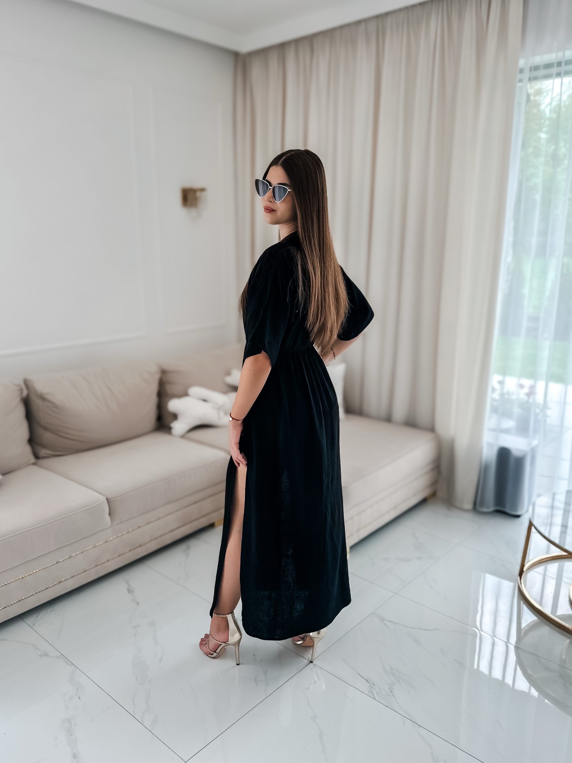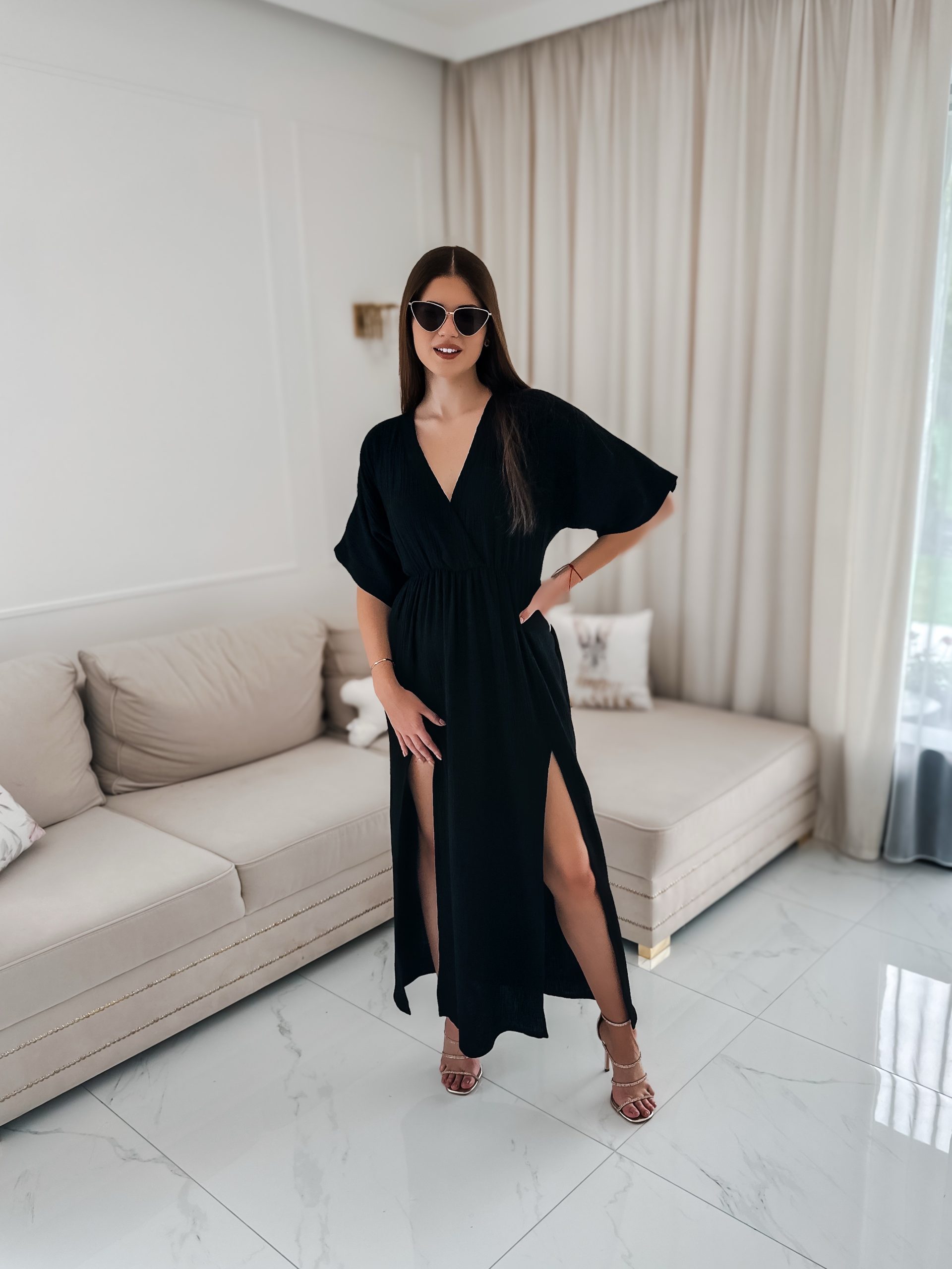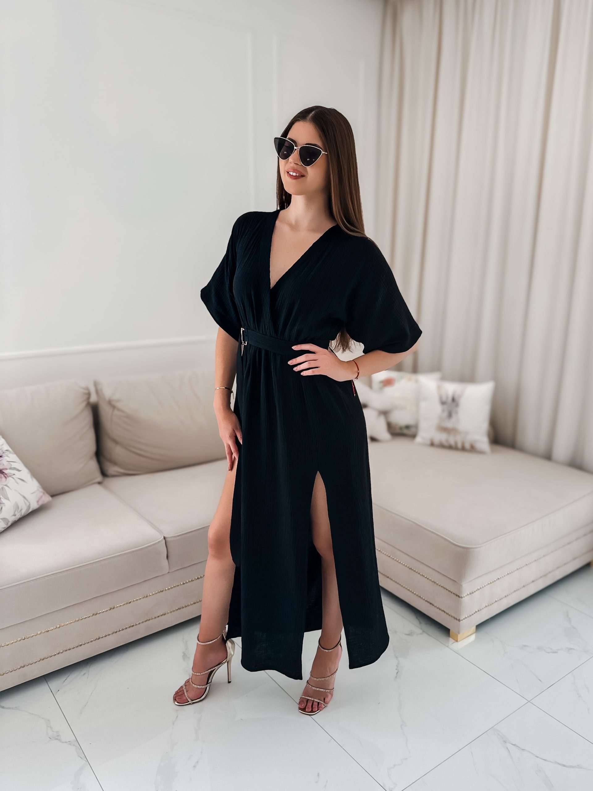 Sukienka muślinowa z dwoma rozcięciami i kimonowym dekoltem czarny