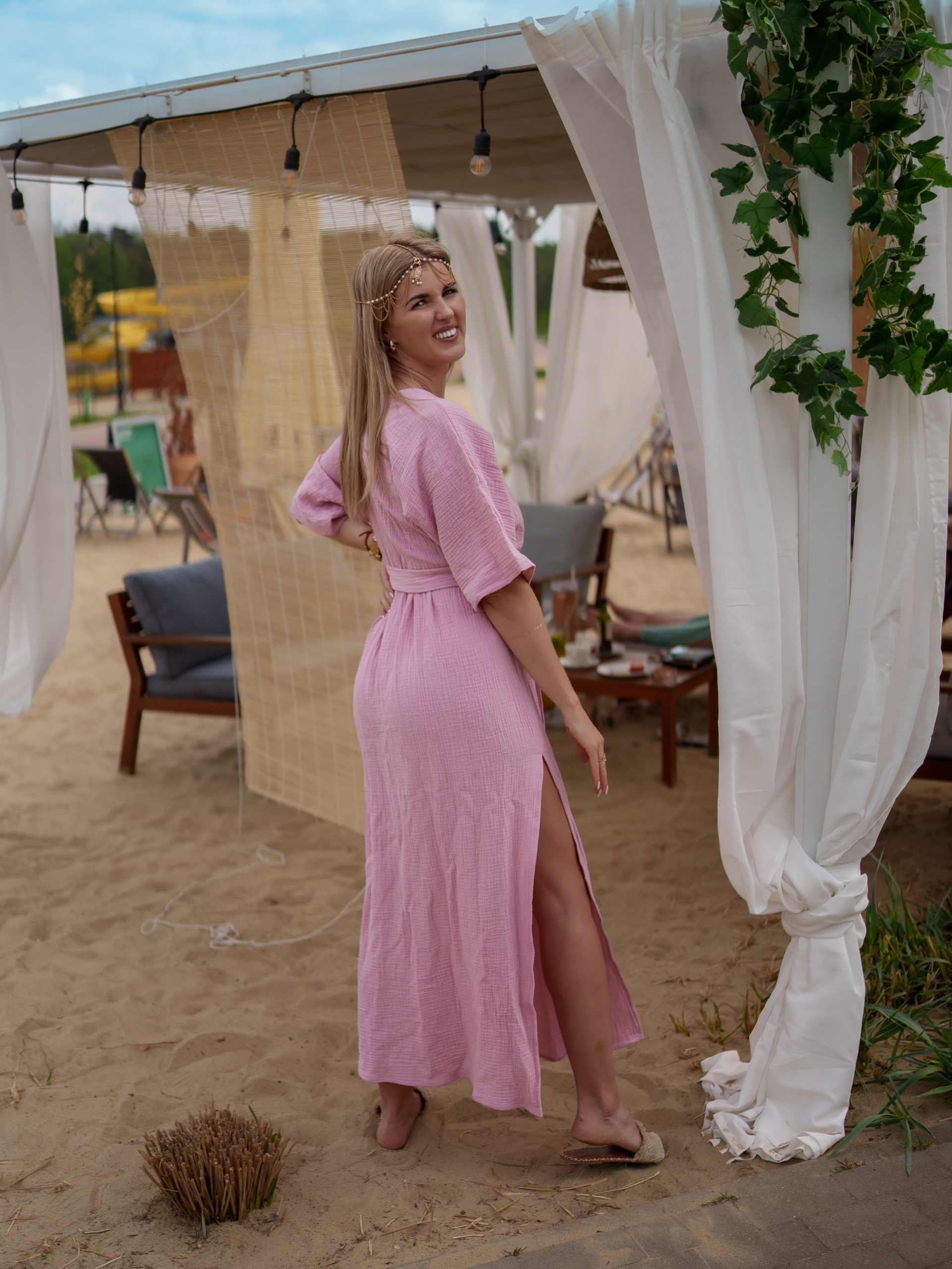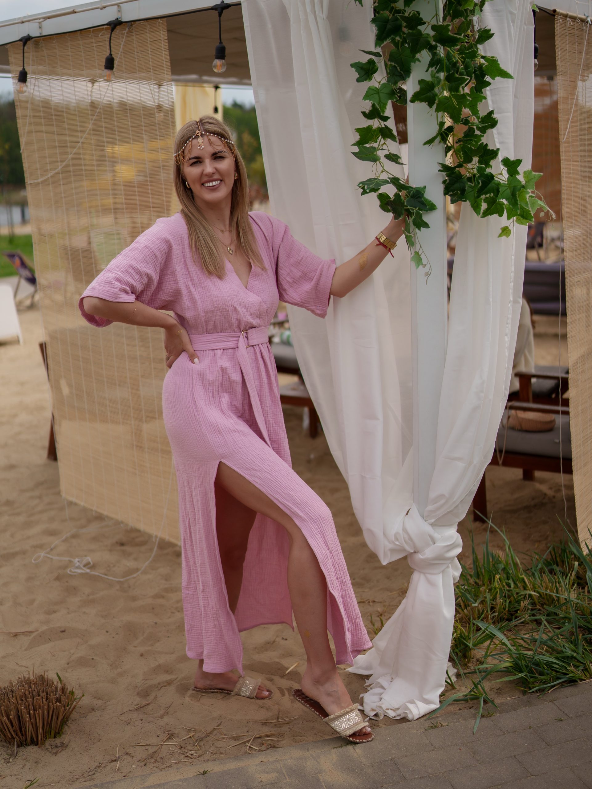 Sukienka muślinowa maxi „Bali” z ręcznie plecionymi warkoczami i rozporkiem beżowa