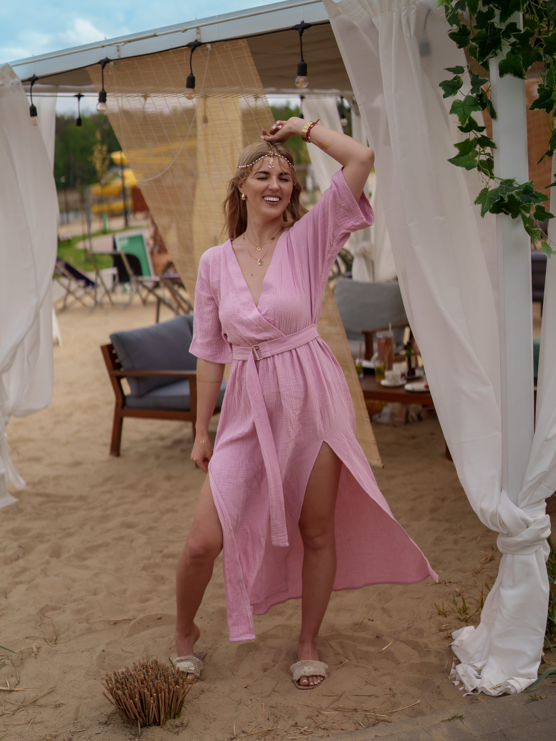 Sukienka muślinowa z dwoma rozcięciami i kimonowym dekoltem – lekkość, styl i kobiecość
