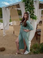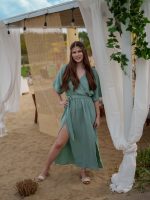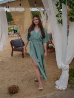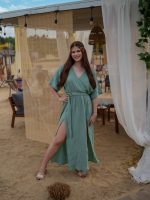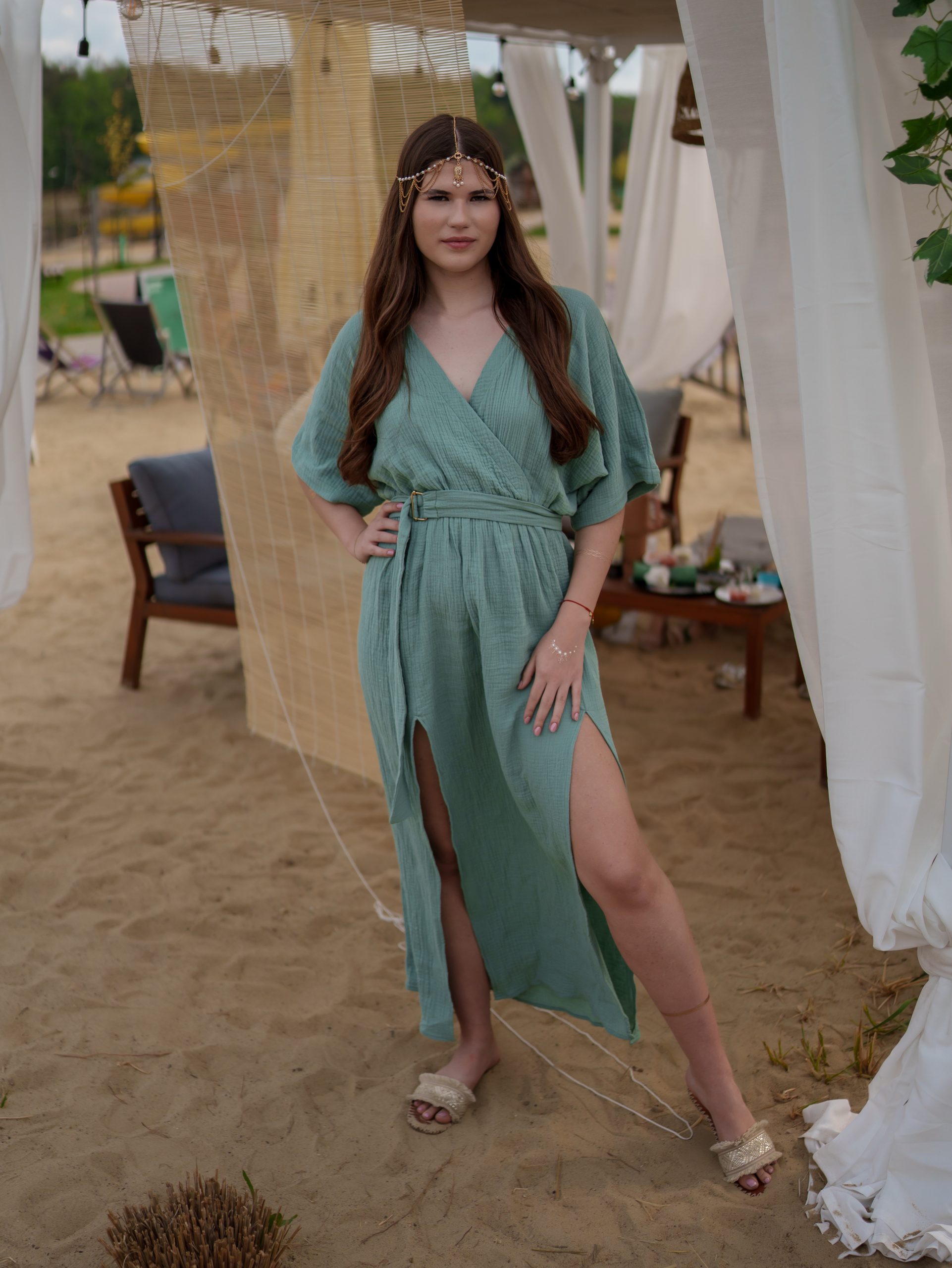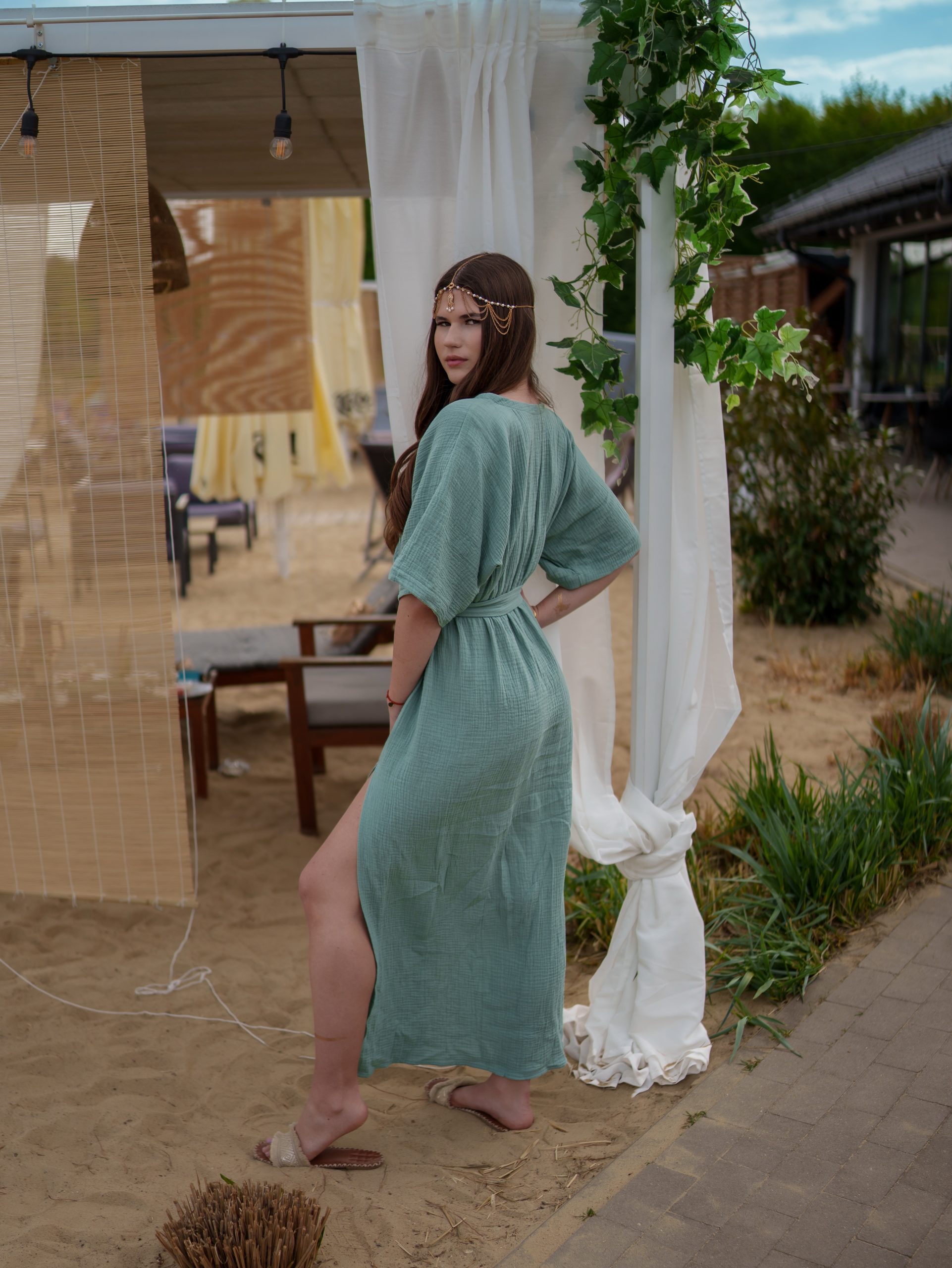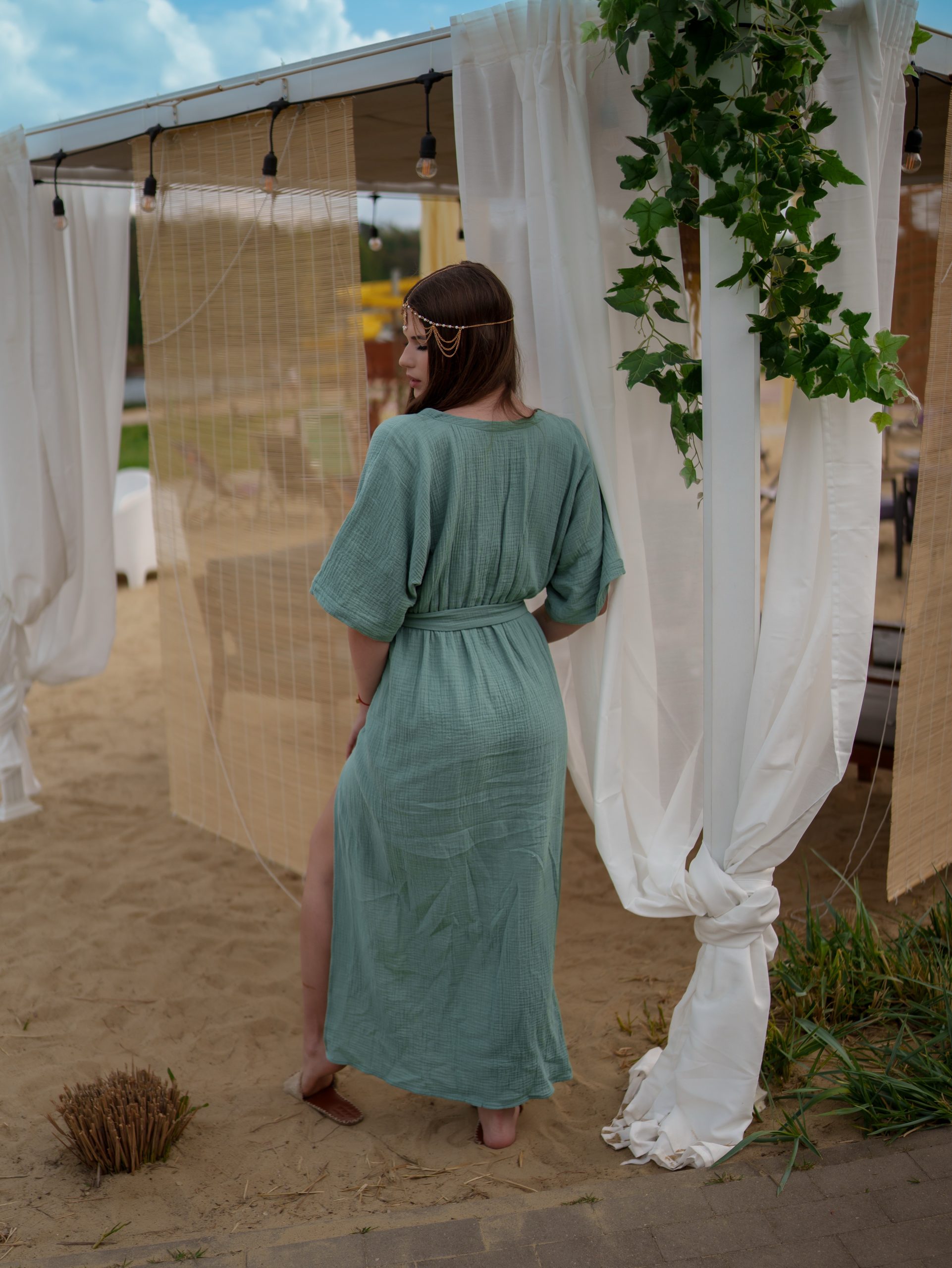Sukienka muślinowa z dwoma rozcięciami i kimonowym dekoltem szałwiowy